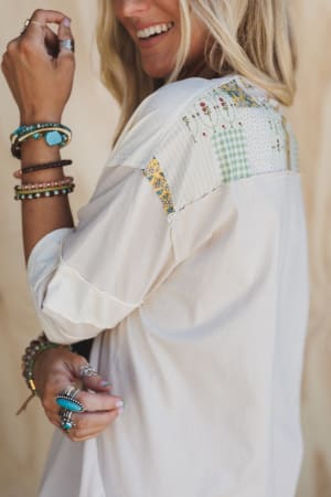 Pair this oversize patchwork tee with denim shorts and sneakers for a summer-ready look.Β