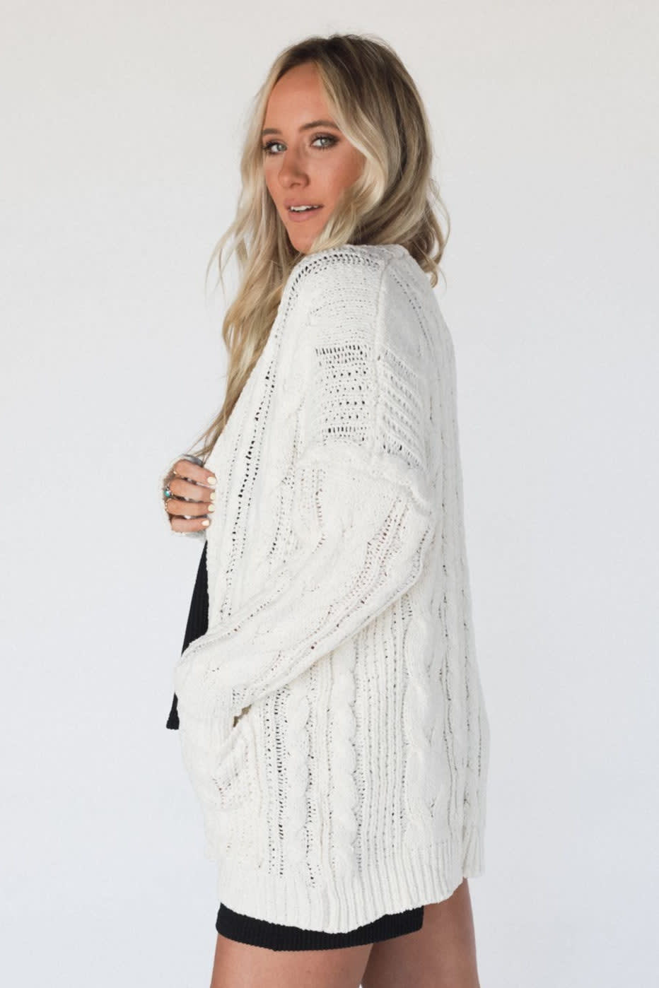 All you’re missing is a book and a cup of cocoa. Get ready to snuggle into this gorgeous cream cable knit cardigan.
