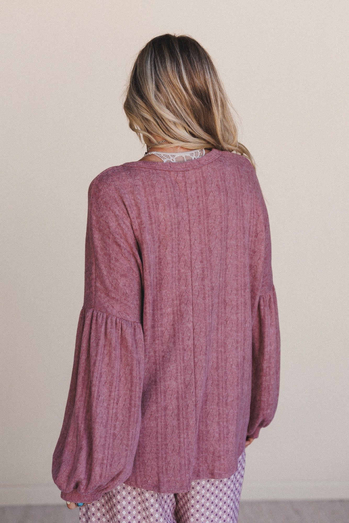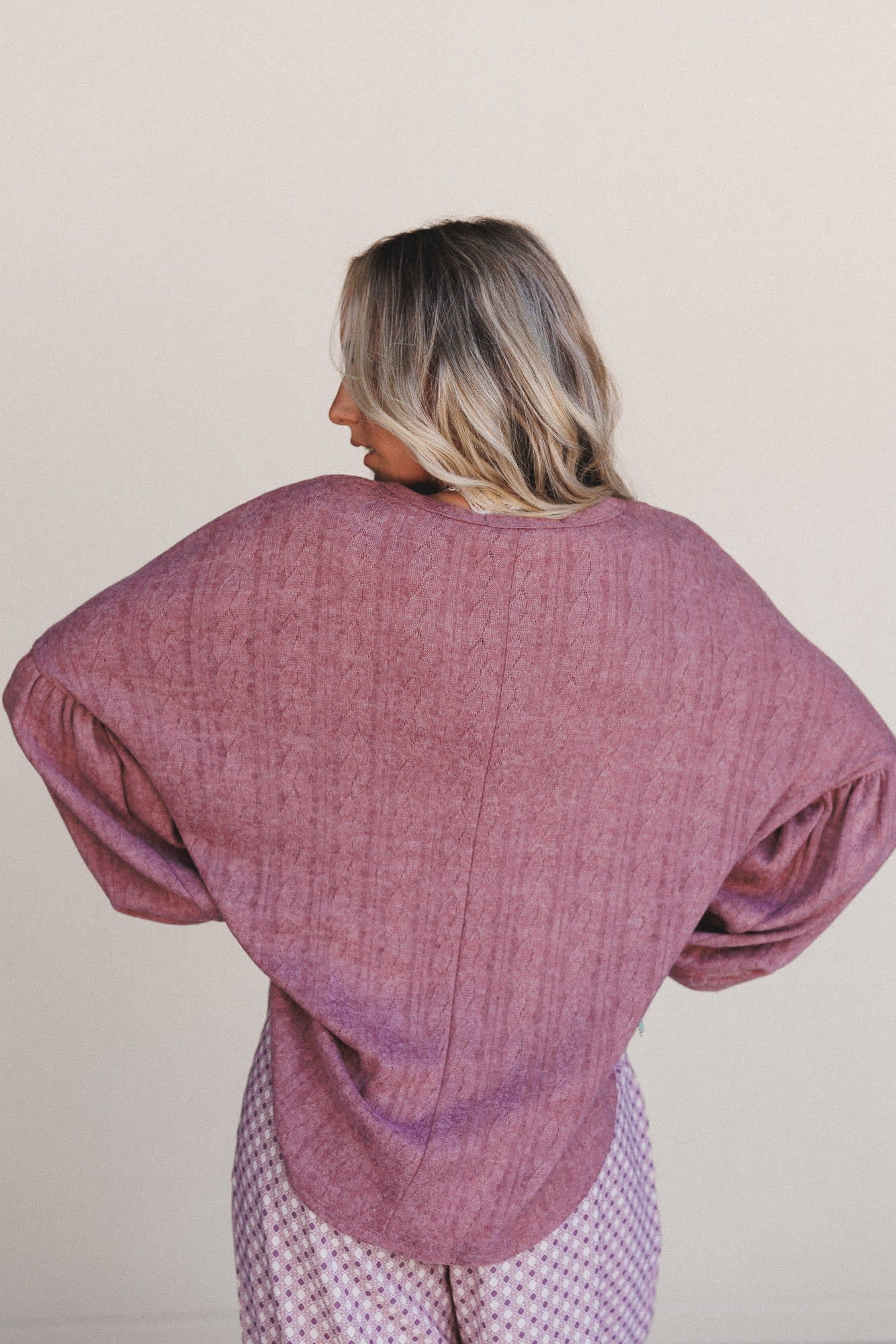 • Dropped shoulders with long balloon sleeves