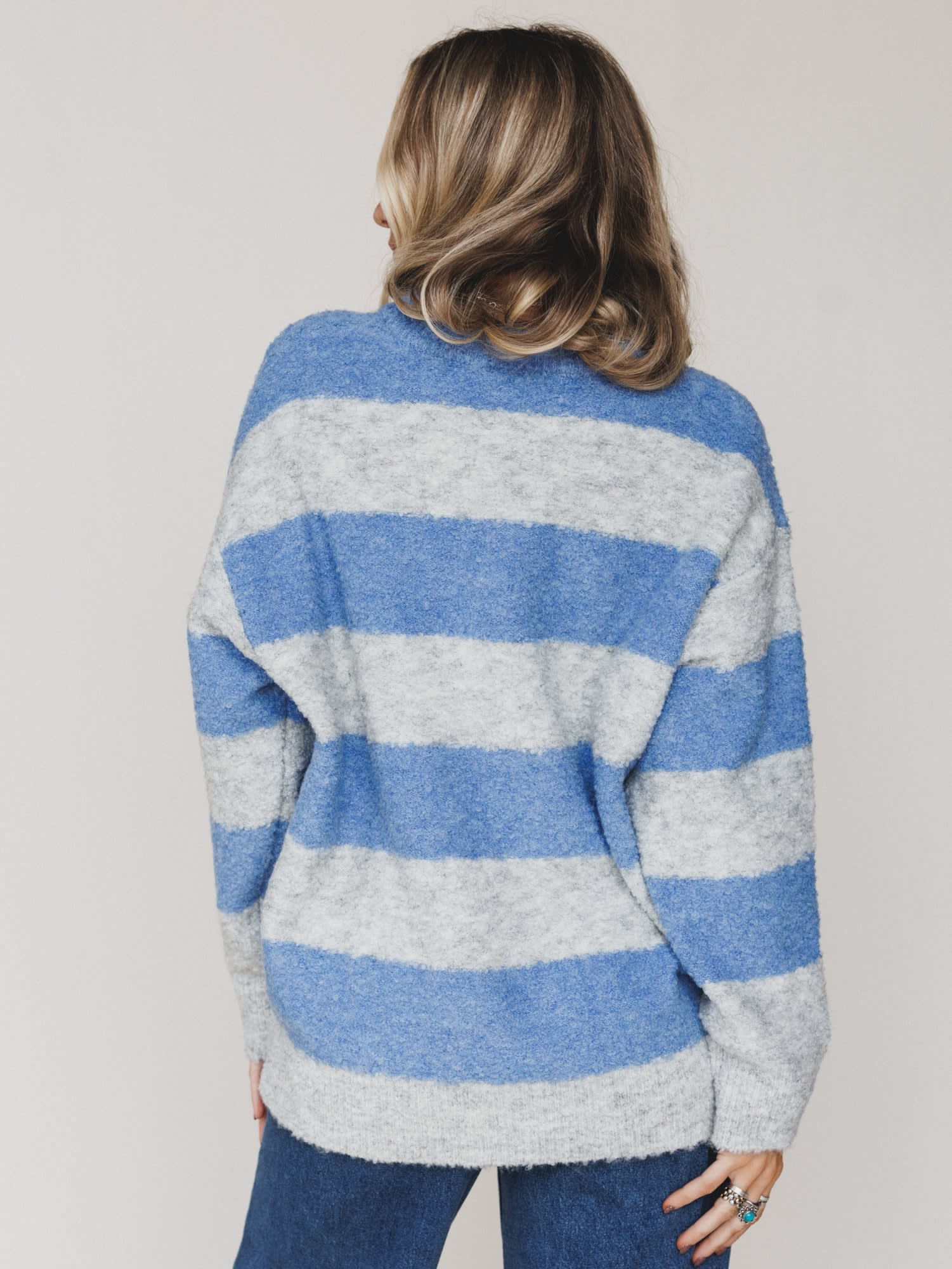 - Chunky horizontal stripes in dreamy blue and cloud grey