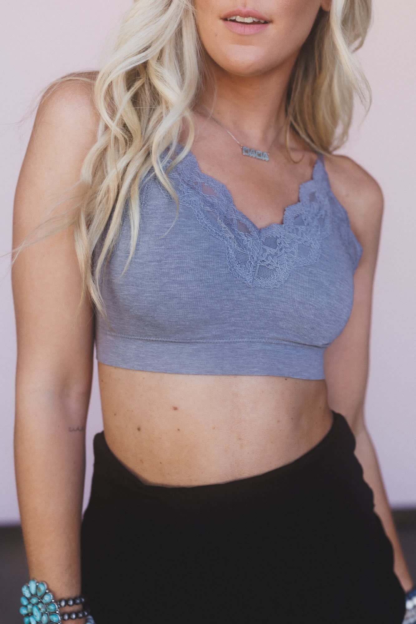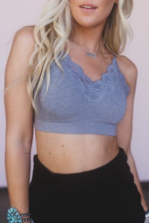 This lace bralette layers perfectly with scoop neck tops and jersey overalls.Β