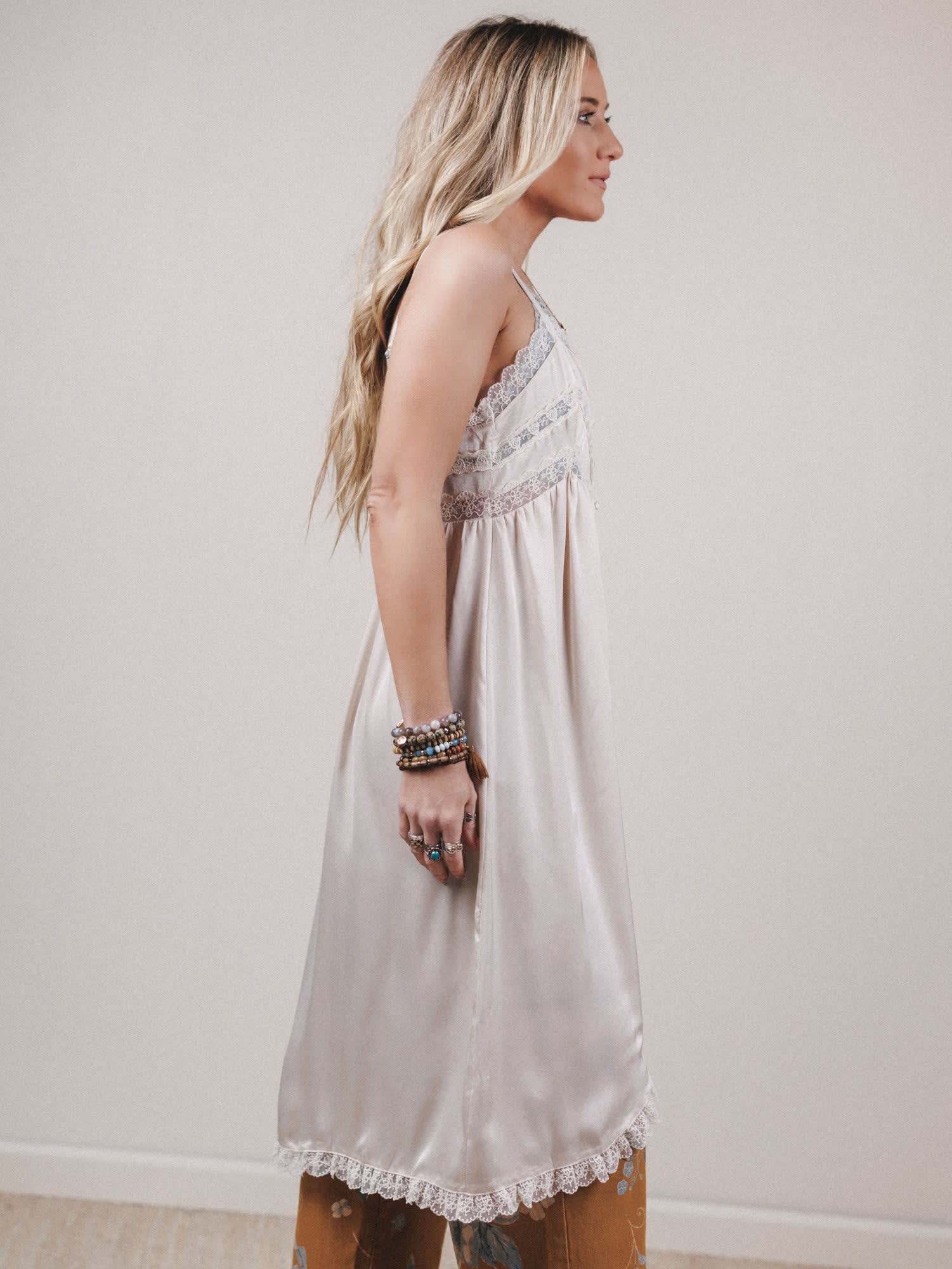 • Soft champagne satin with mixed lace panels in soft blue and ivory tones