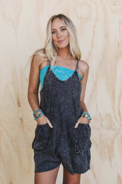 - Laid-back yet totally statement-making, this washed black romper is your shortcut to summer ease. Toss it on with a bandeau or tee and hit the road with your favorite playlist.