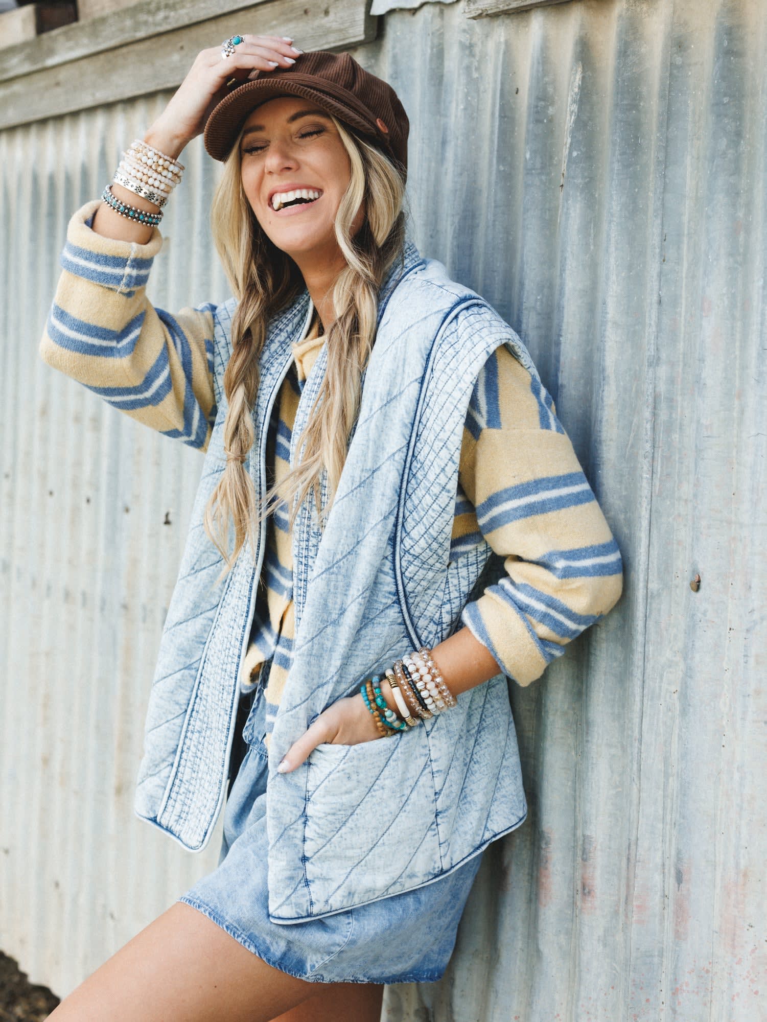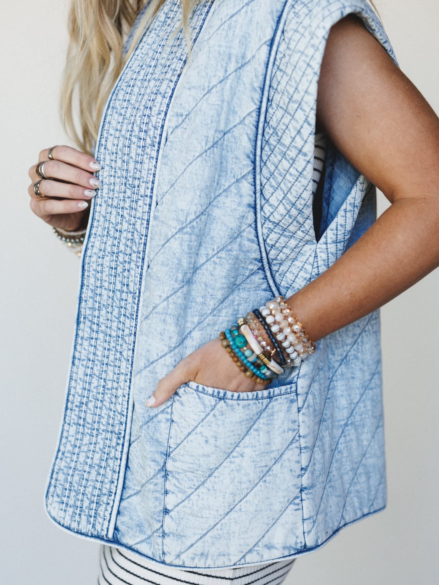 - The Soft Edge Vest adds dimension with its quilted texture, open front, and relaxed shape in a versatile light wash tone.