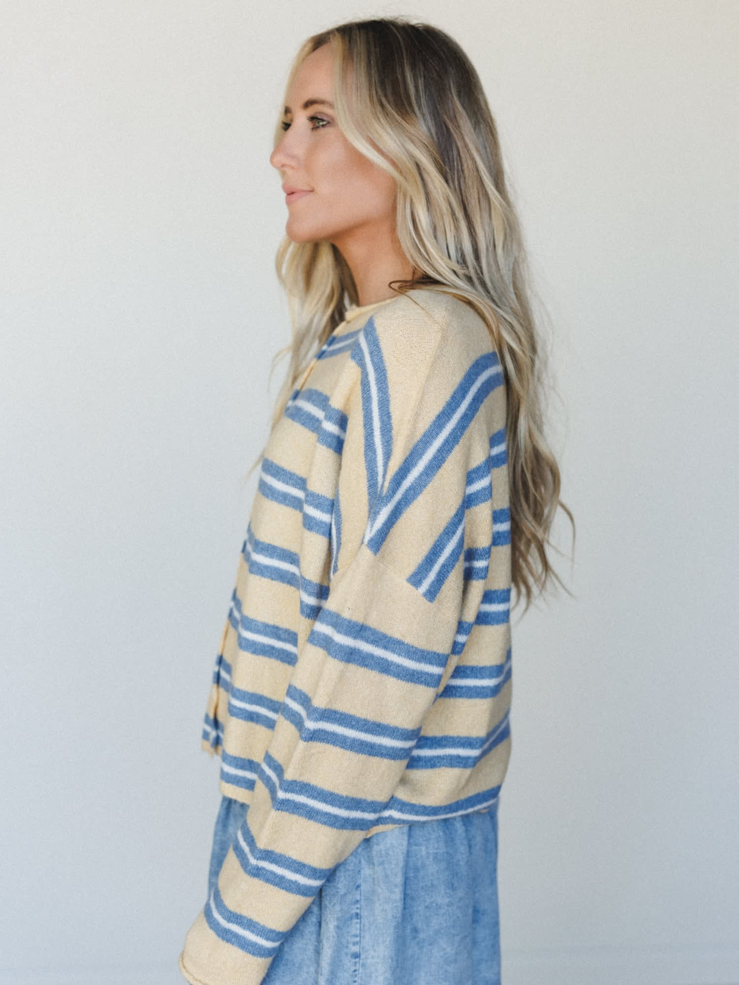- The Birdie Button Down Cardigan features a relaxed fit with a lightweight knit and classic button front in a soft butter yellow and dusty blue stripe for a cozy, casual layer.