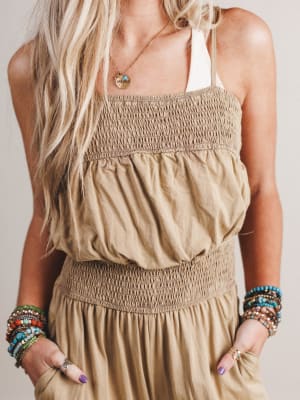 • Smocked bodice and wide waistband for a flattering, flexible fit