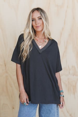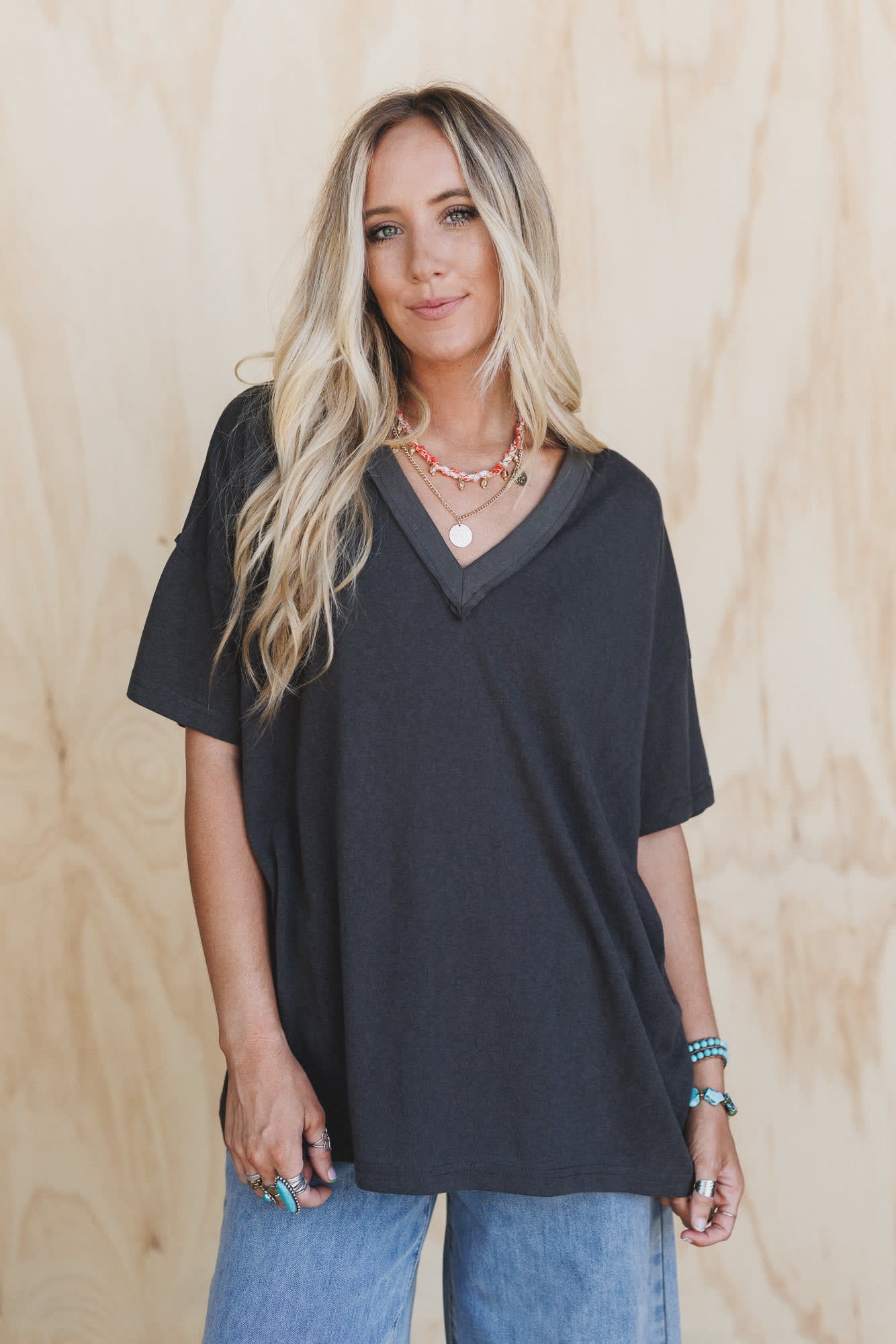 This simple layering tee is instantly elevated when tucked into a maxi shirt and paired with booties.