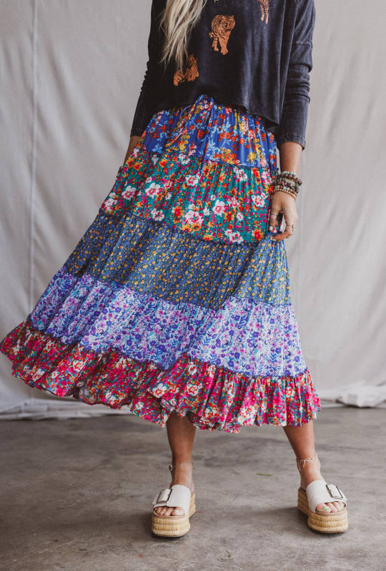 Get ready to make a statement in this tiered boho maxi skirt with its bright, vibrant pattern.