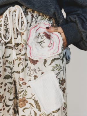• Oversized patch pockets with raw edges and fabric flower appliqués