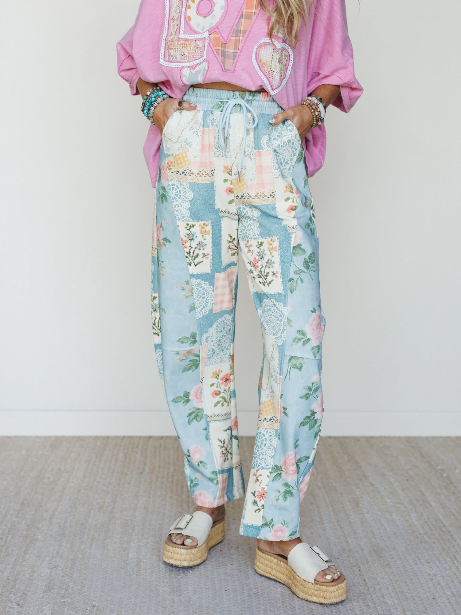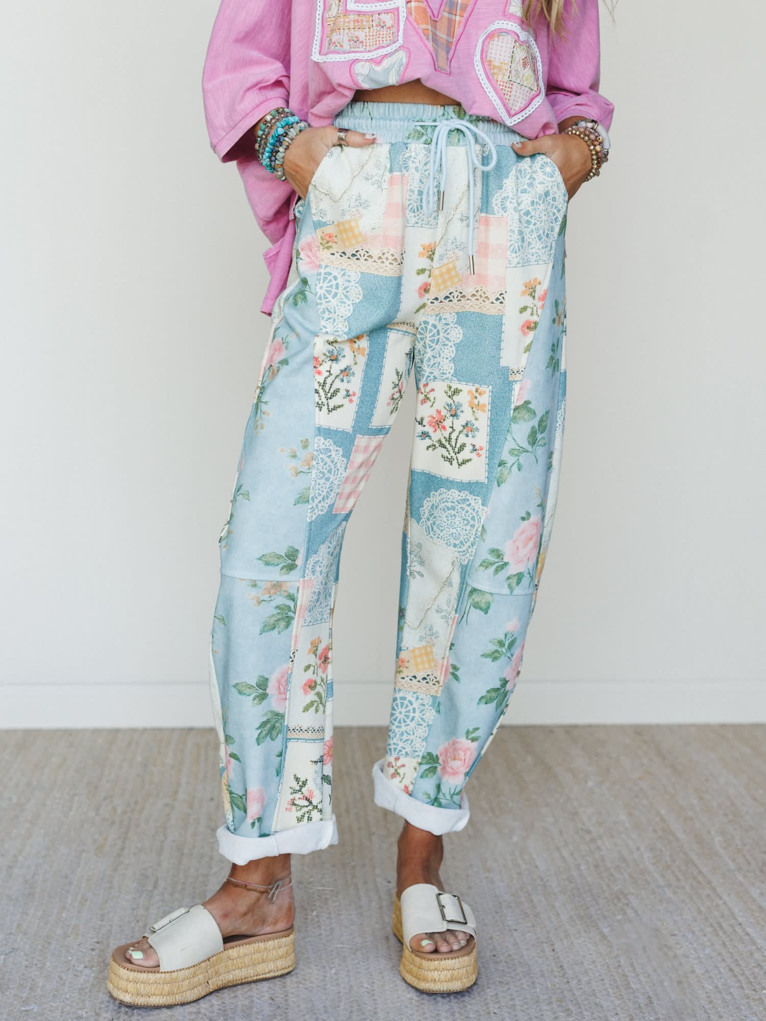 • The High Tea Garden Barrel Lounge Pants feature a relaxed barrel-leg fit in a whimsical blue and blush patchwork floral print with lace doily details, an elastic drawstring waistband, and deep side pockets for all-day comfort.