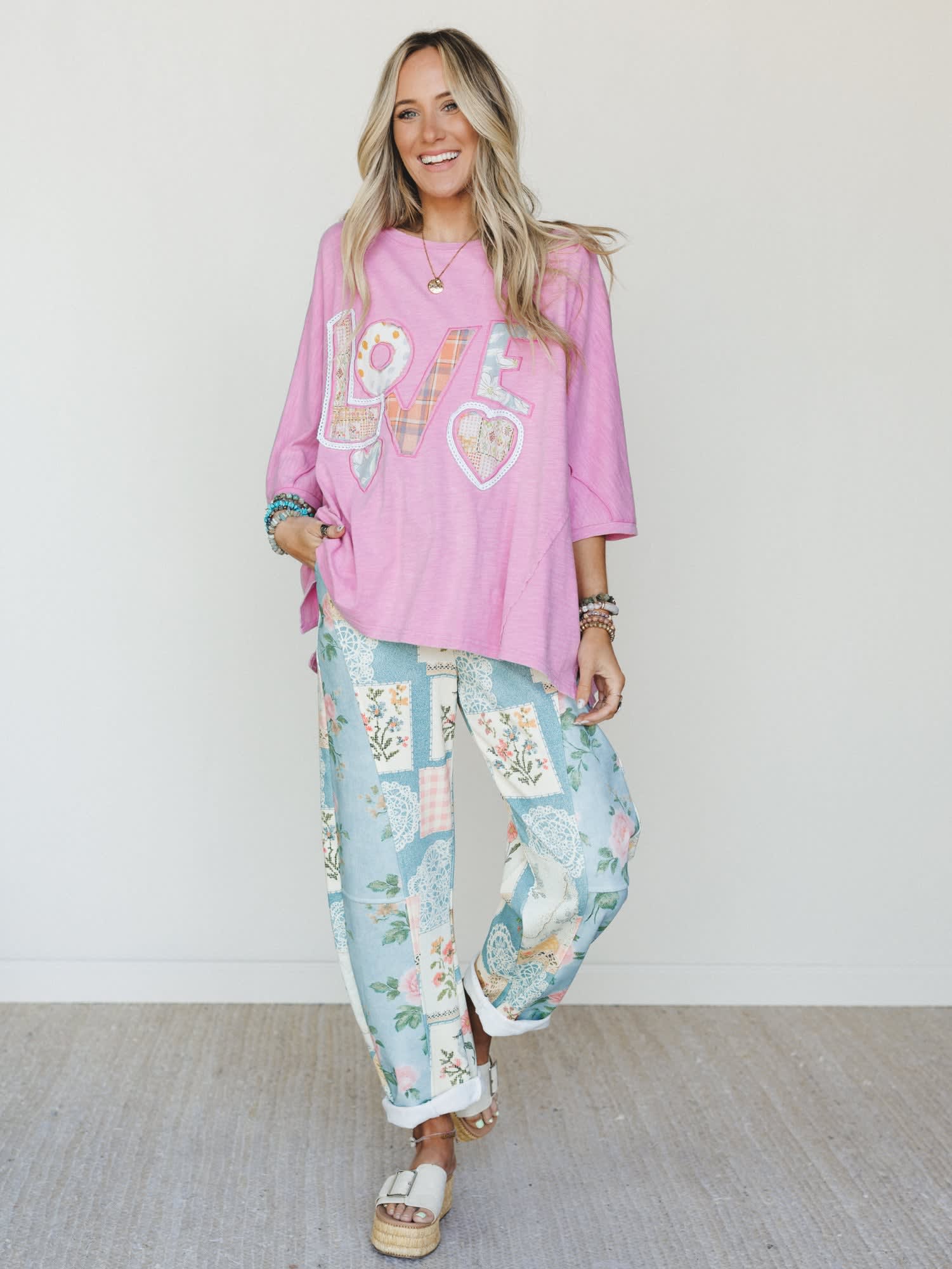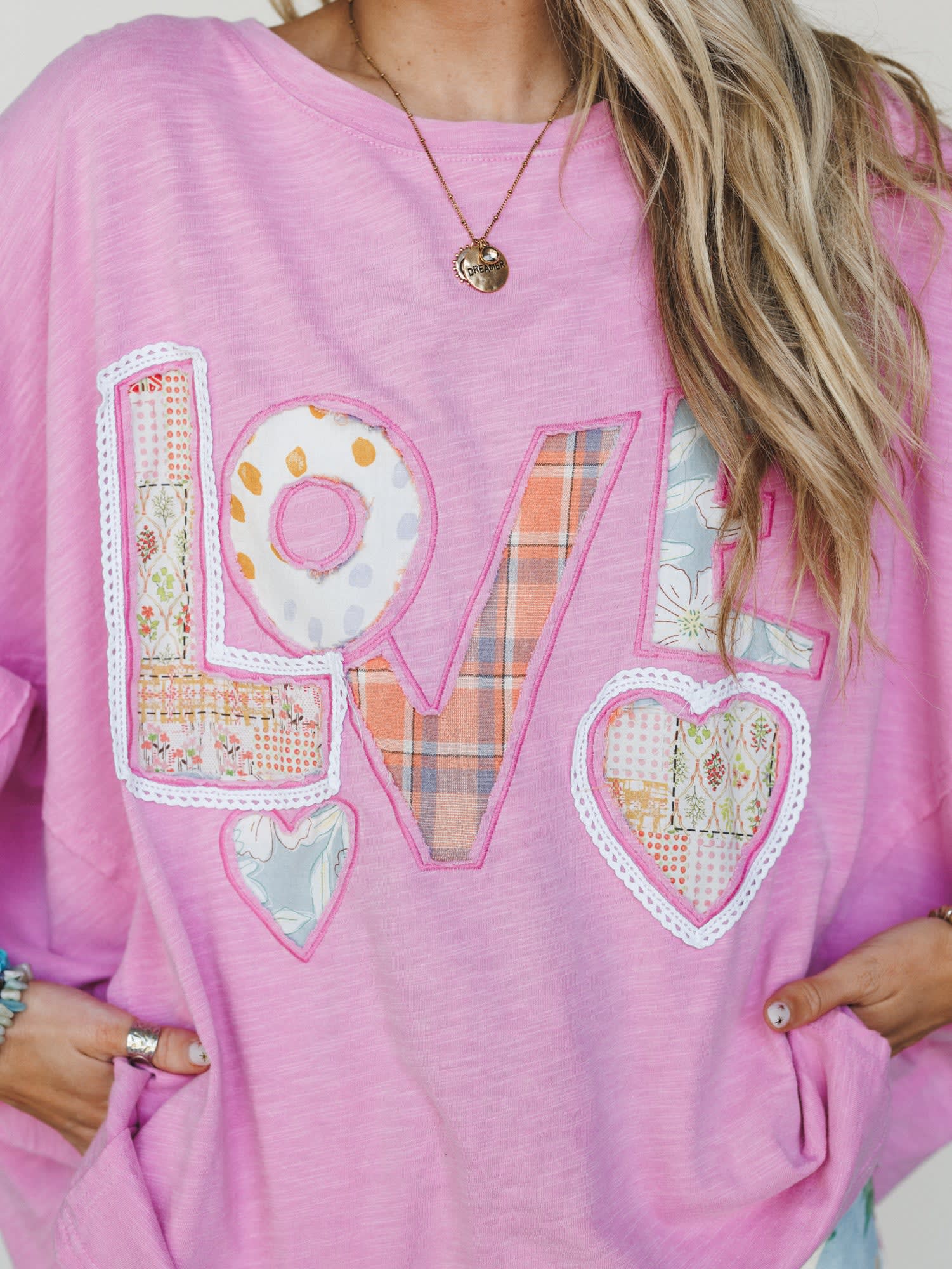 • The All In Love Tee is an oversized, boxy pink graphic tee with a patchwork applique "LOVE" design in mixed prints, lace trim, and heart details for a sweet, free-spirited womens boho top moment.