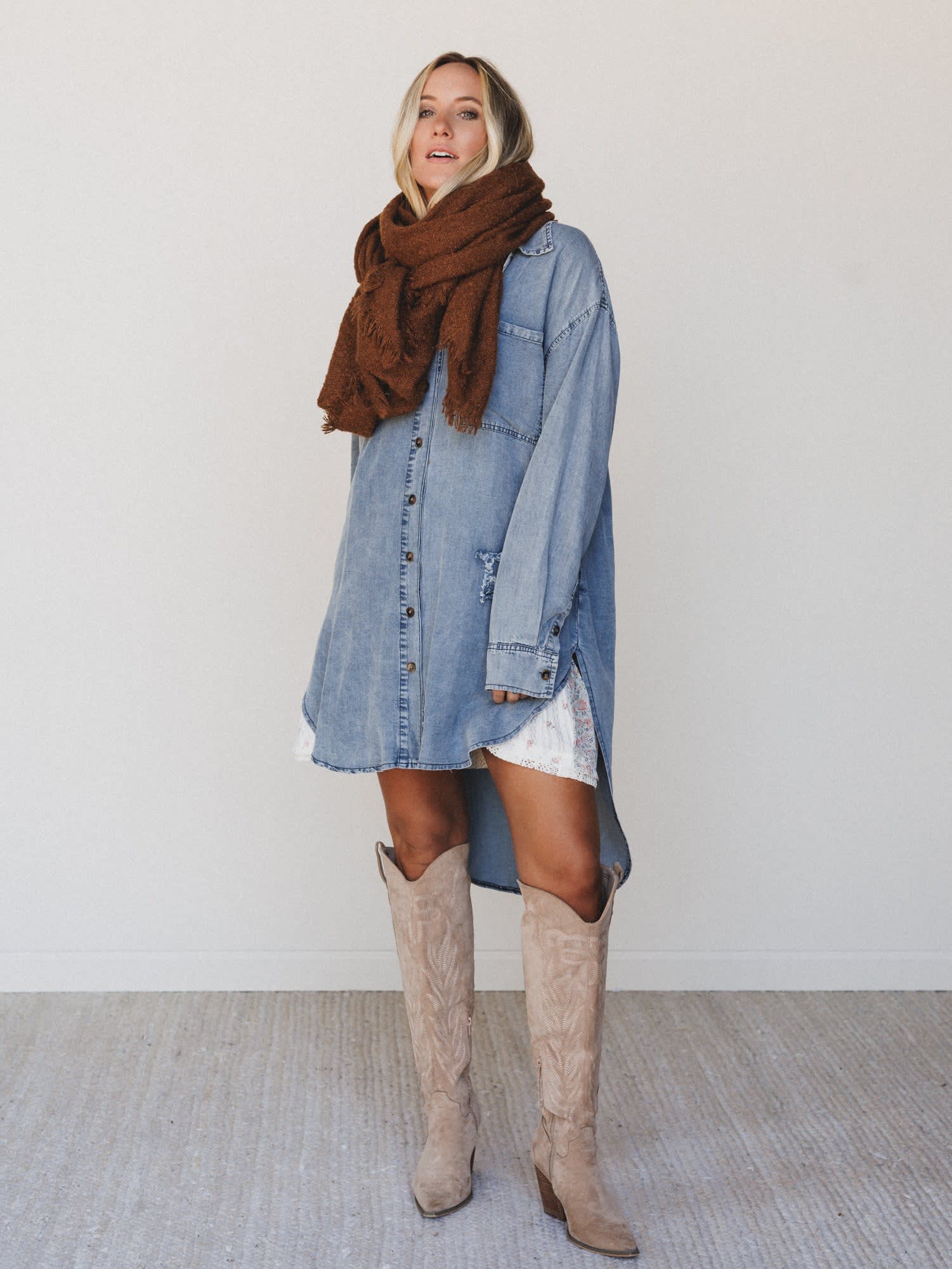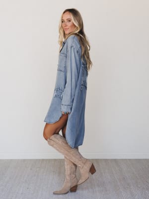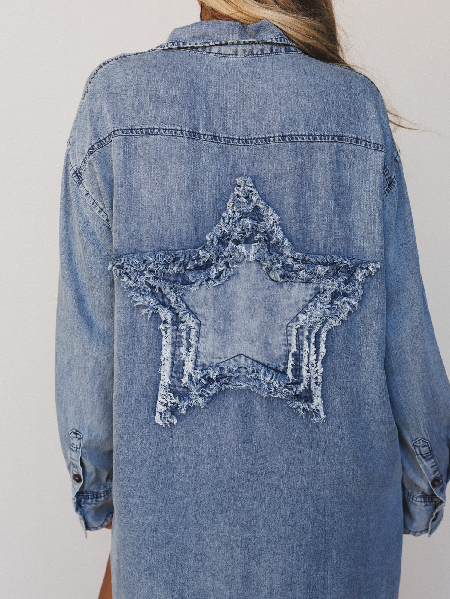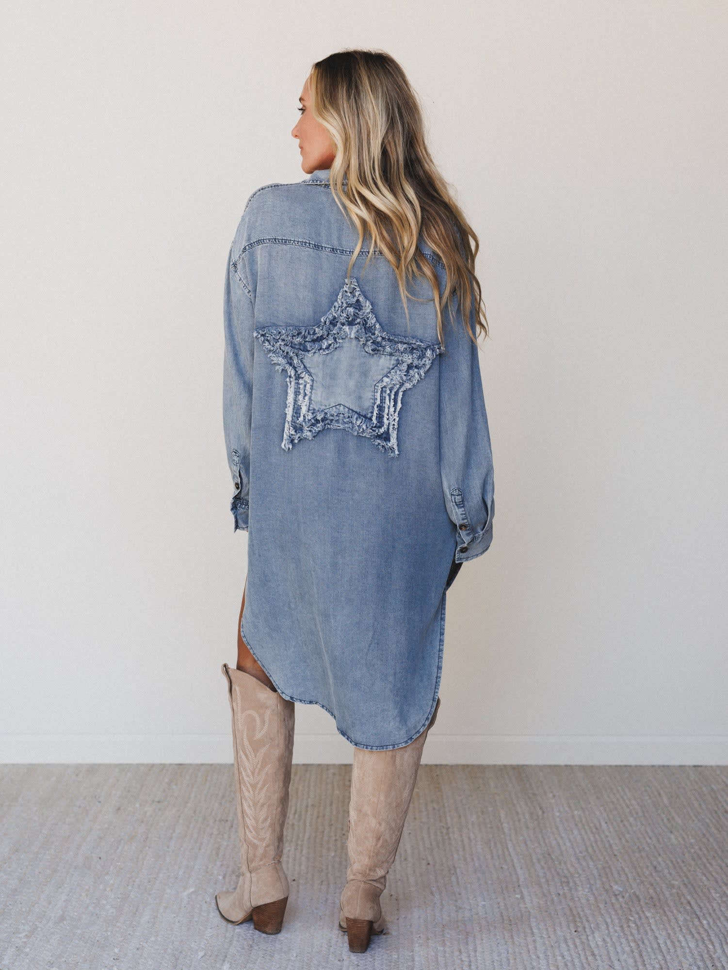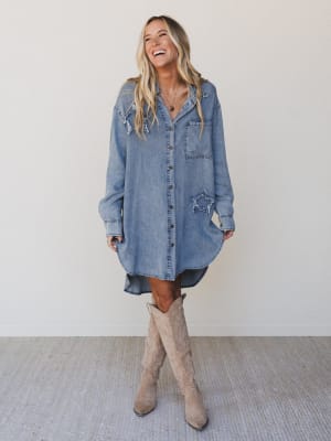 - Outrider Button Down Denim Dress – Oversized for that easy, laid-back vibe, with star patch details that add just the right touch of boho charm. Wear it solo or layer it up.