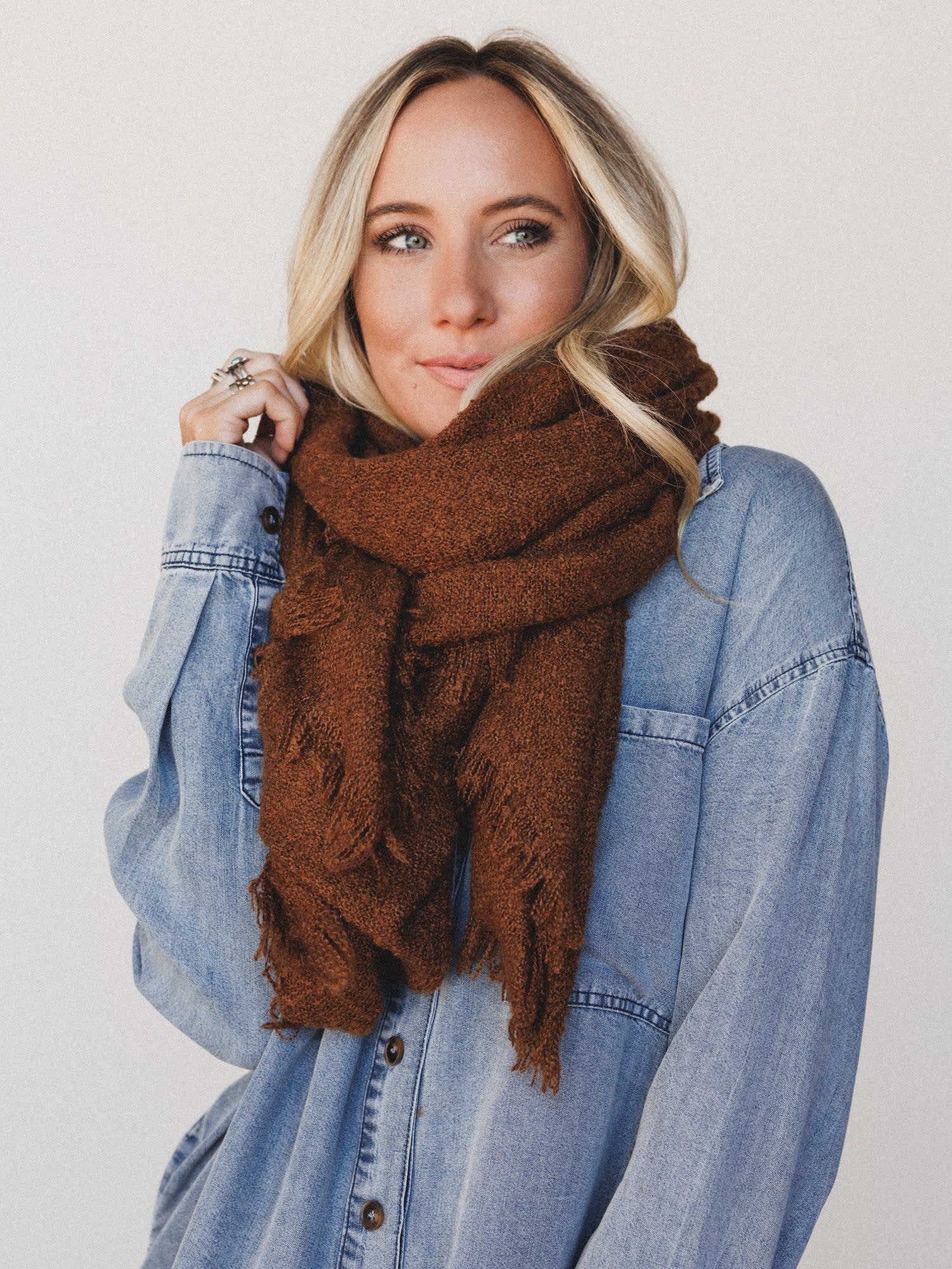- Cabin Calling Blanket Scarf – In a rich, earthy brown, this chunky knit scarf brings instant warmth and texture to your look—like wrapping yourself in your favorite throw, but make it fashion.