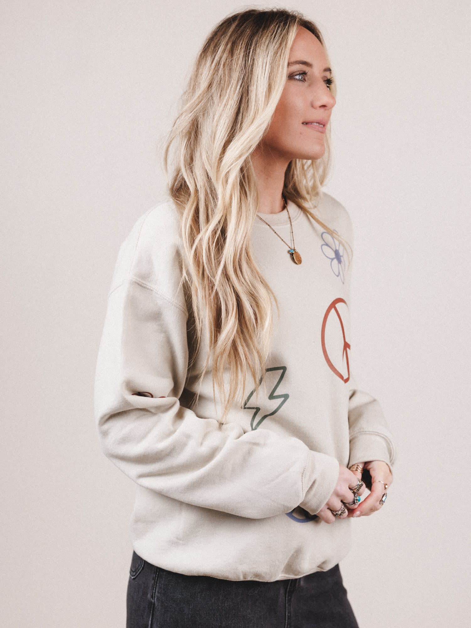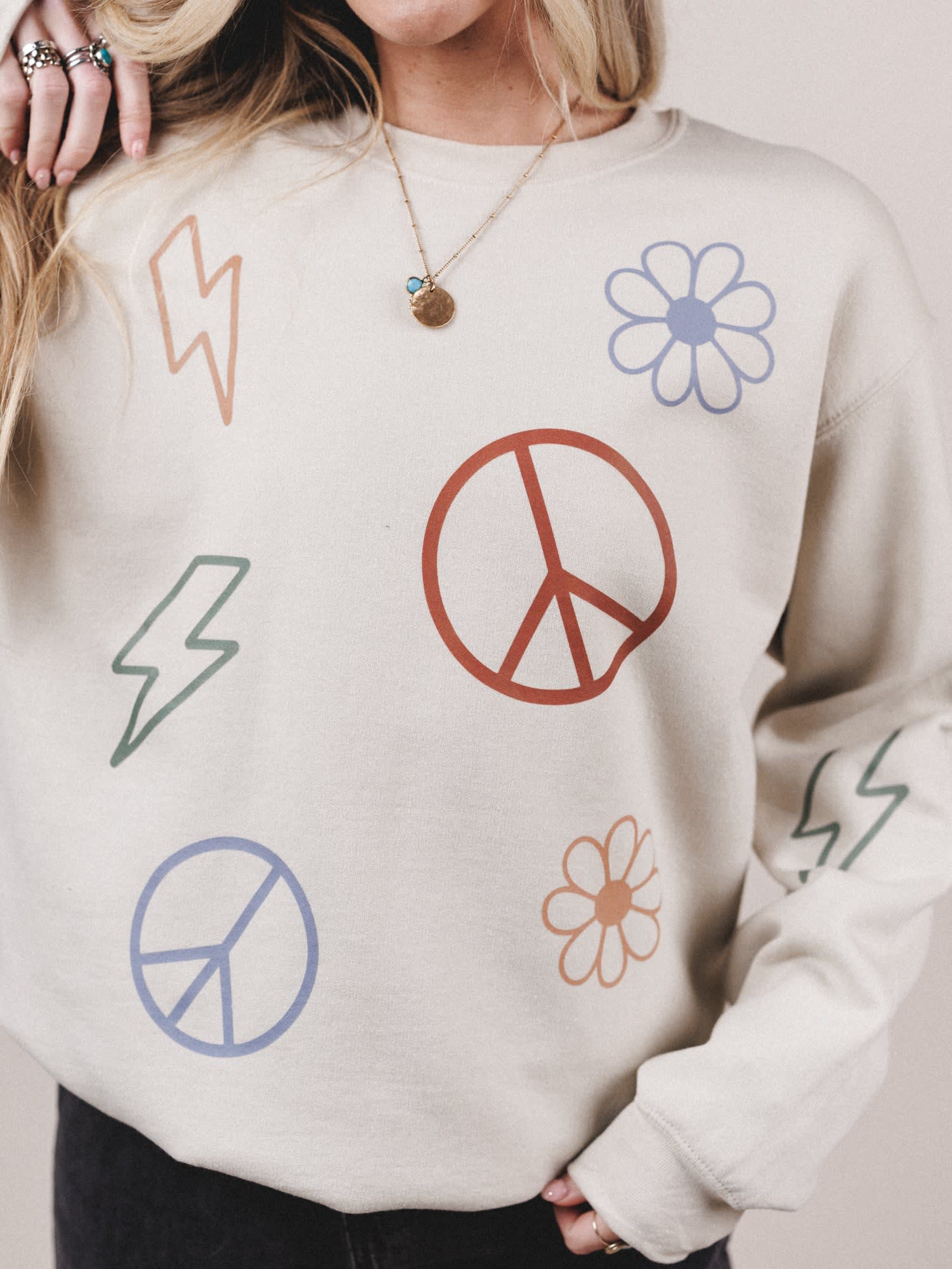 Feel-good vibes meet everyday comfort in The Nest Boho All Over Sweatshirt. With playful peace signs, flowers, and lightning bolts scattered across a soft sand base, this cozy pullover is your new go-to for laid-back days with a touch of whimsy.
