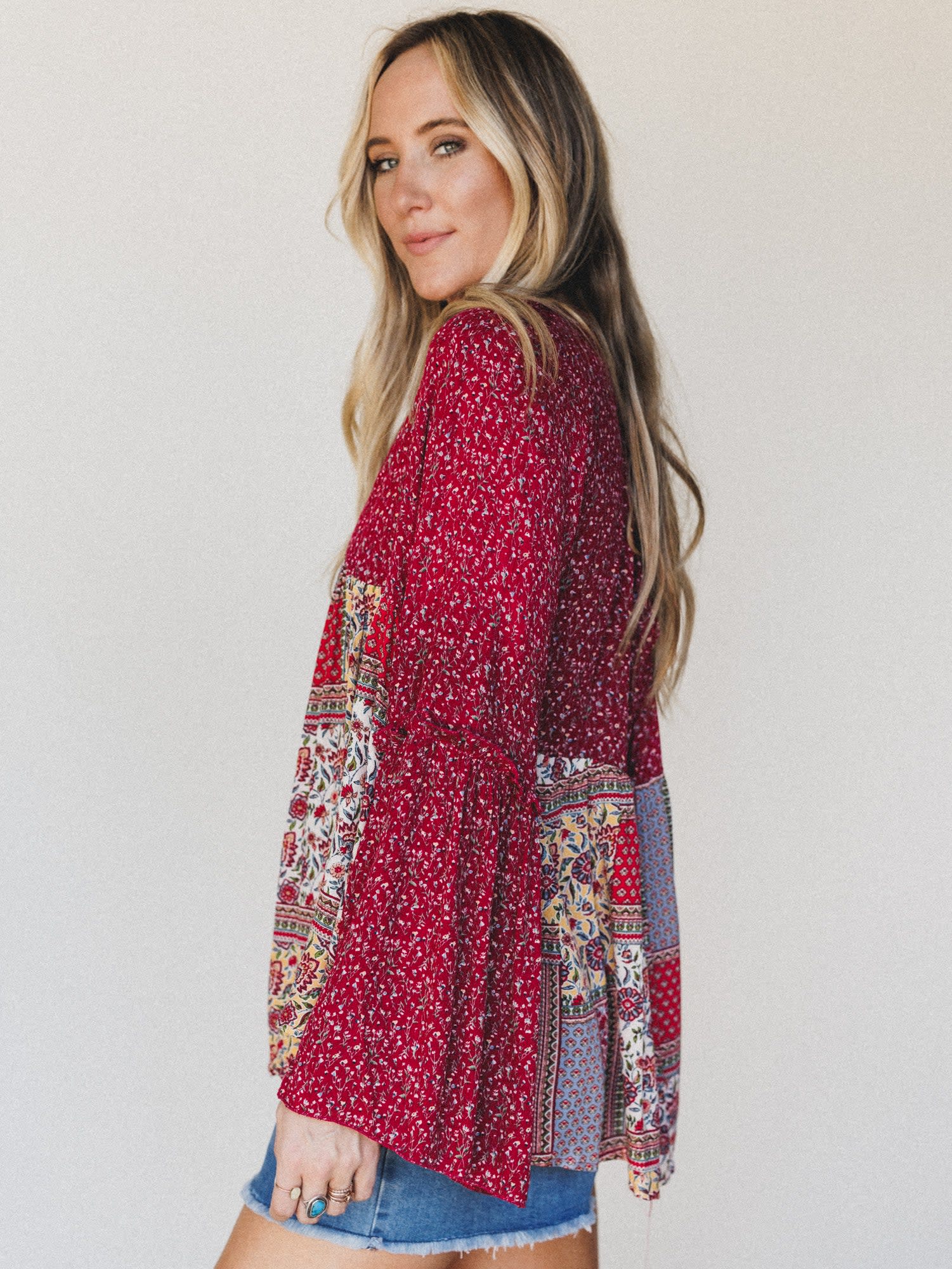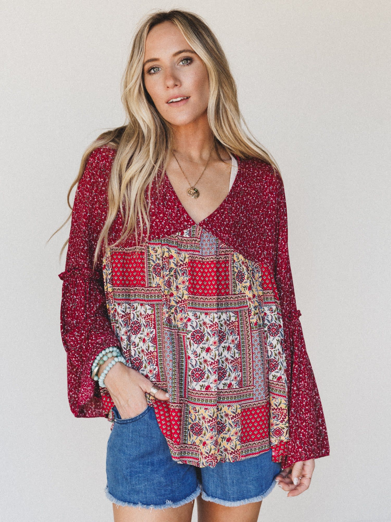 • A mixed patchwork print combines a ditsy floral body with a bold border hem, giving this blouse that eclectic, free-spirited energy that sets it apart from anything basic.