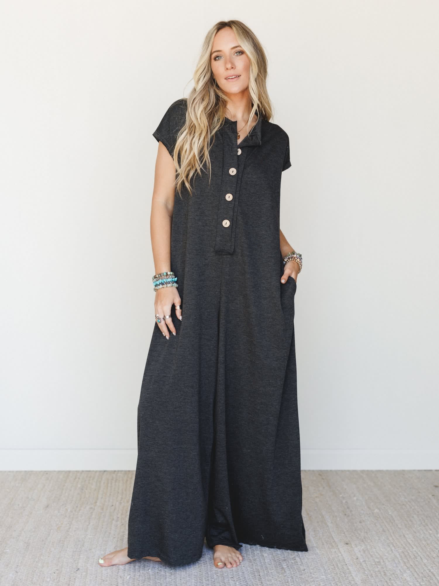• Side pockets hit at just the right spot — functional, deep, and always a welcome surprise in a jumpsuit.