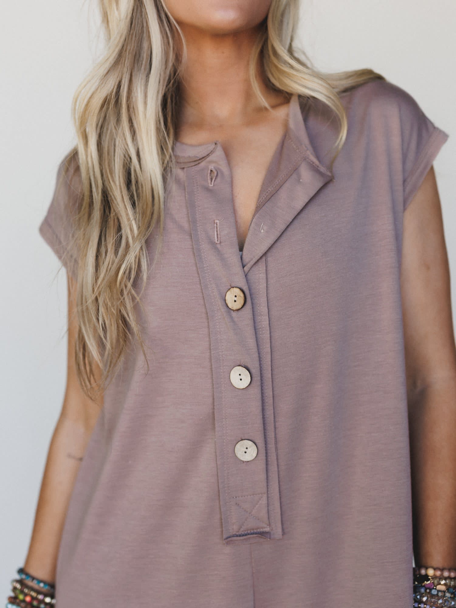 • Button-front henley neckline with capped sleeves keeps the top structured and polished while the wide leg does all the drama below.