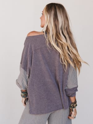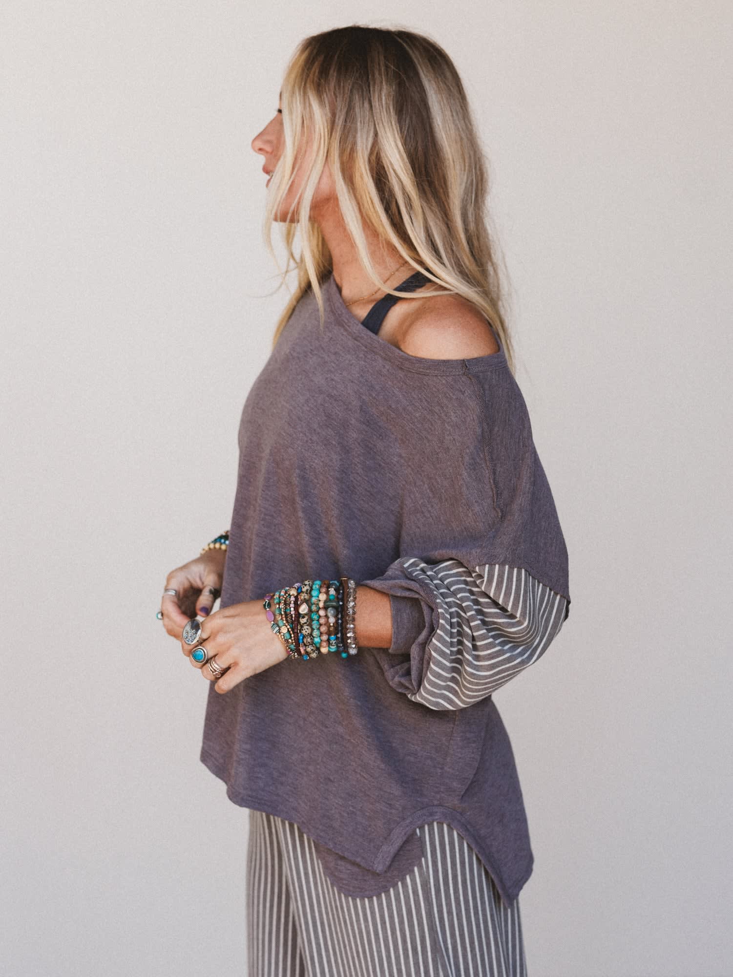 • Oversized top with drop shoulders, contrast striped sleeves, and slouchy neckline