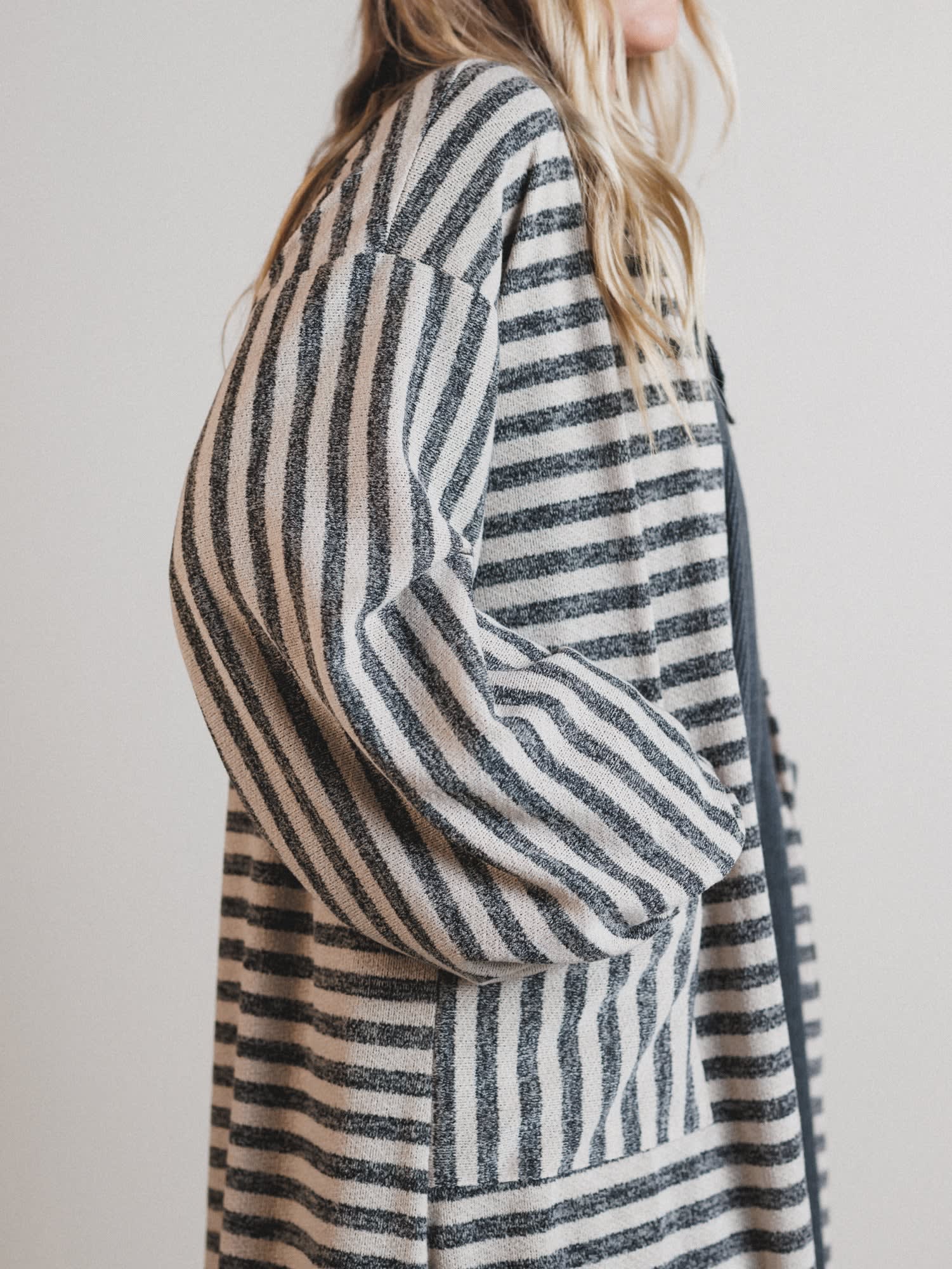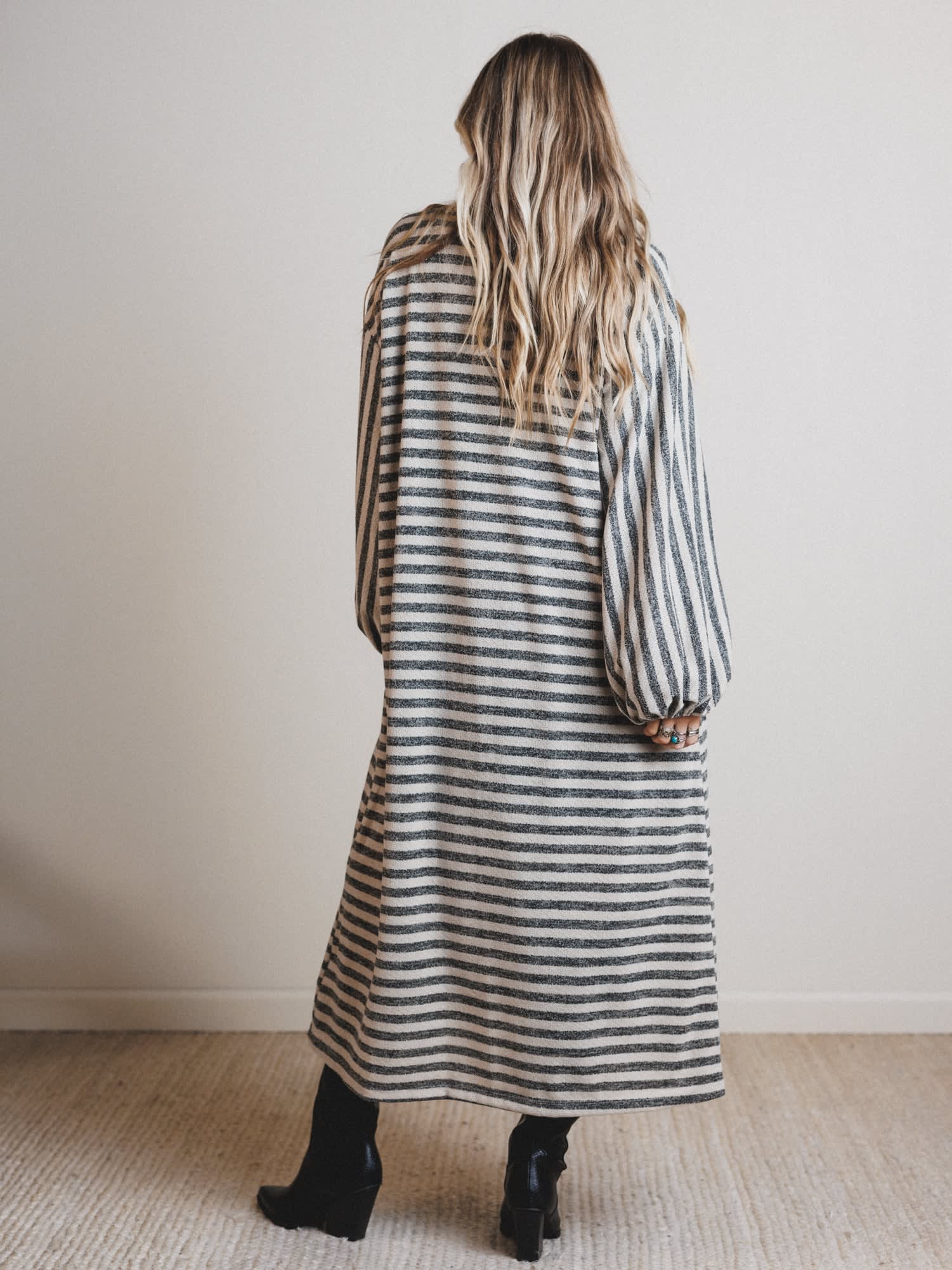 Wrap yourself in cozy elegance with this striped cardigan that’s equal parts relaxed and refined. Whether you're lounging fireside or styling it over your weekend denim for a coffee date, this layering piece is pure effortless charm.