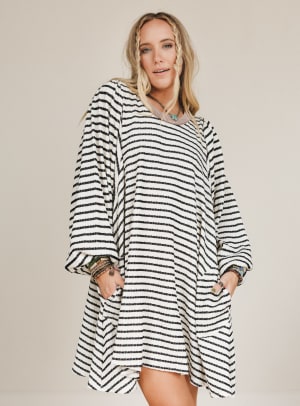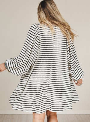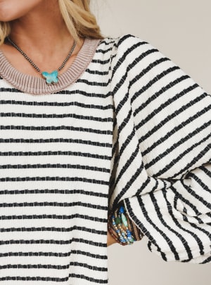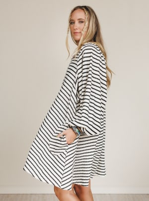 - Black and cream textured stripe in a breezy, oversized silhouette