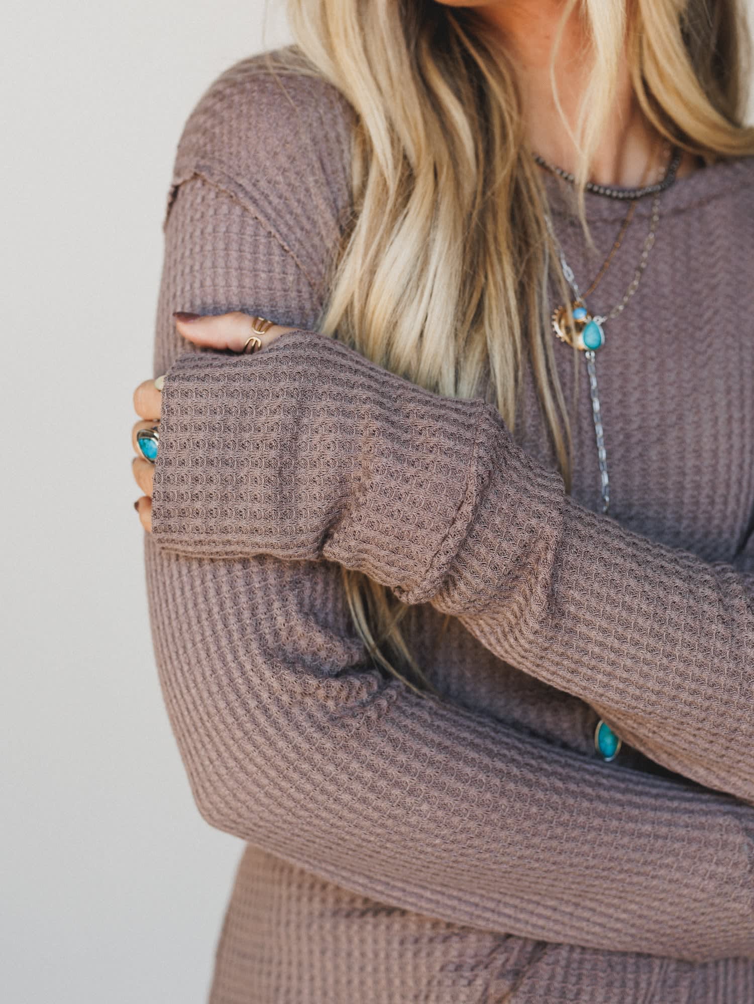 - Lightweight waffle knit in a dusty mocha hue that pairs with anything