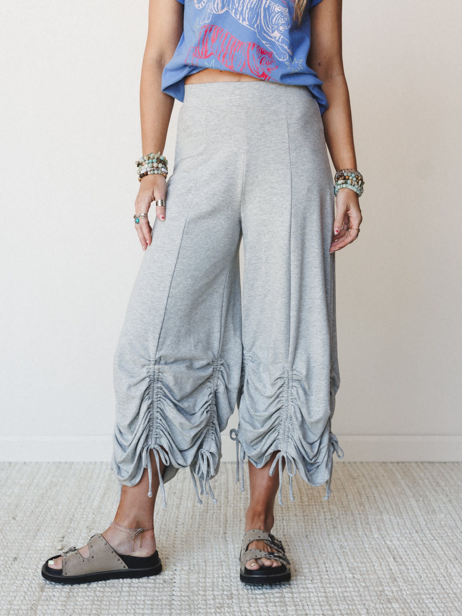 When you're wondering what to wear on a lazy Sunday or need the perfect boho outfits for casual adventures, these drawstring pants deliver effortless bohemian style. The relaxed wide leg silhouette with playful ruched drawstring details at the hem creates a free-spirited look that's pure boho chic.