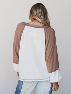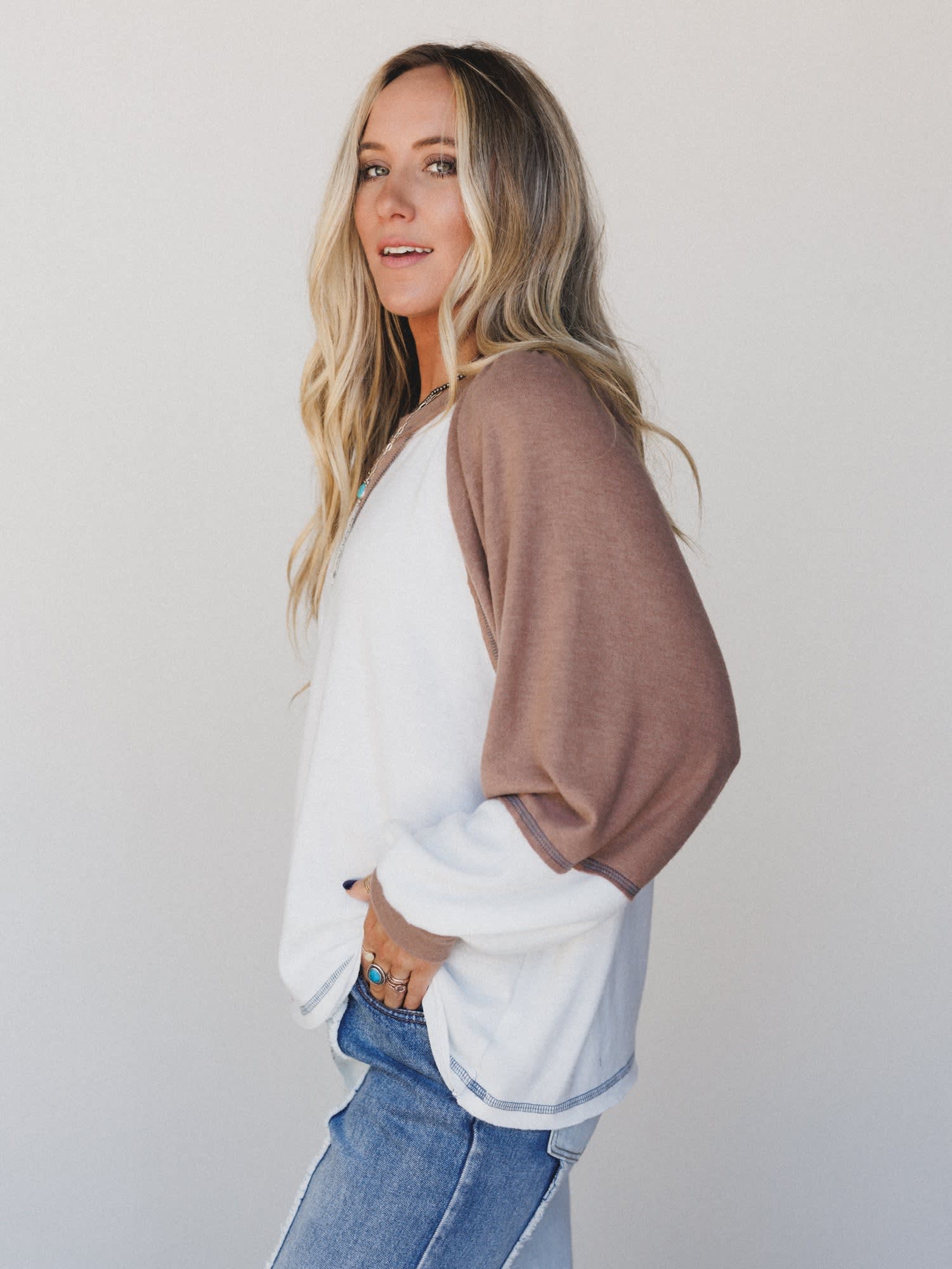 • Soft brushed knit in creamy white with warm mocha contrast sleeves