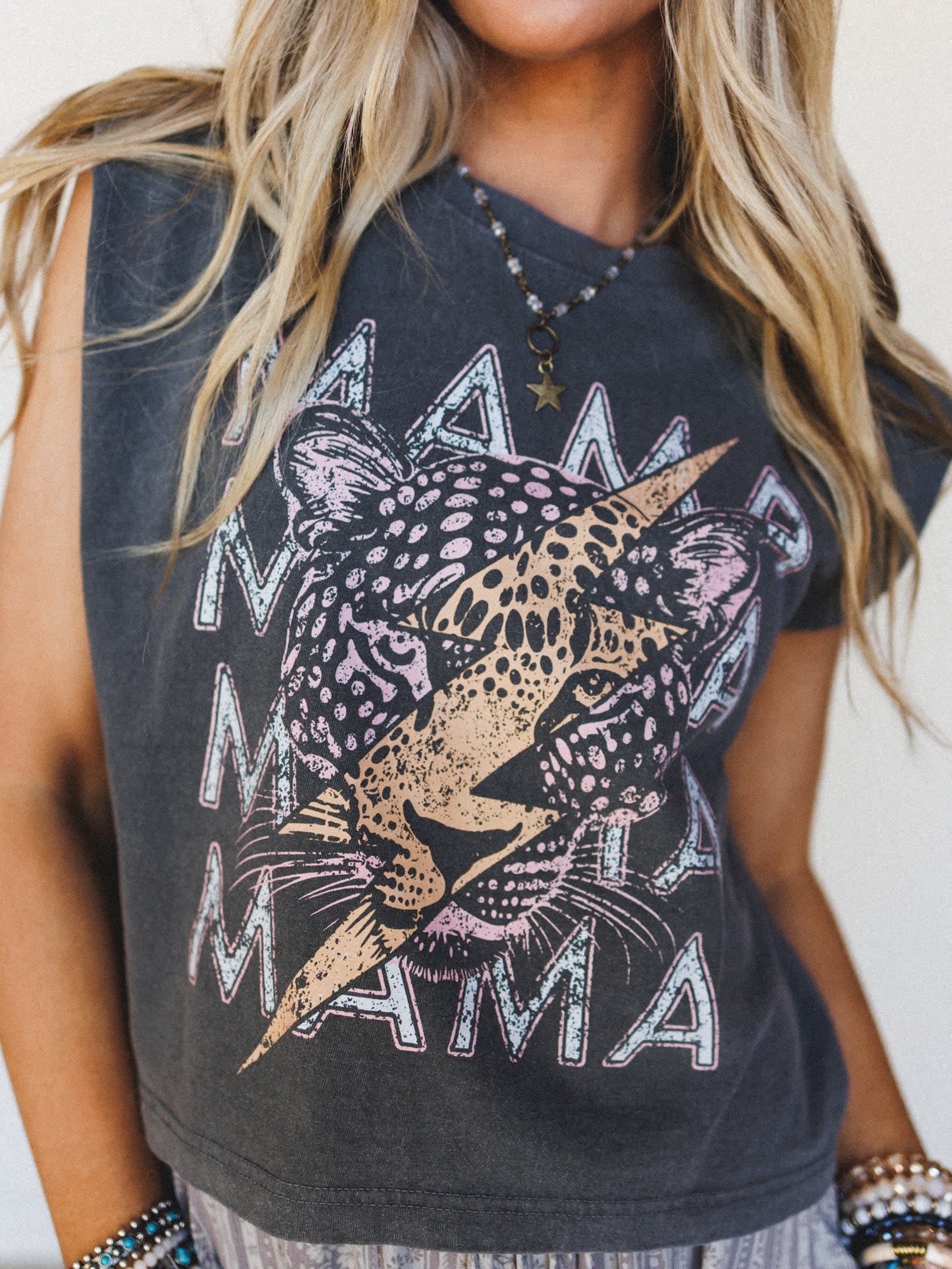 • Leopard “Mama” graphic with lightning bolt detail for a bold boho statement