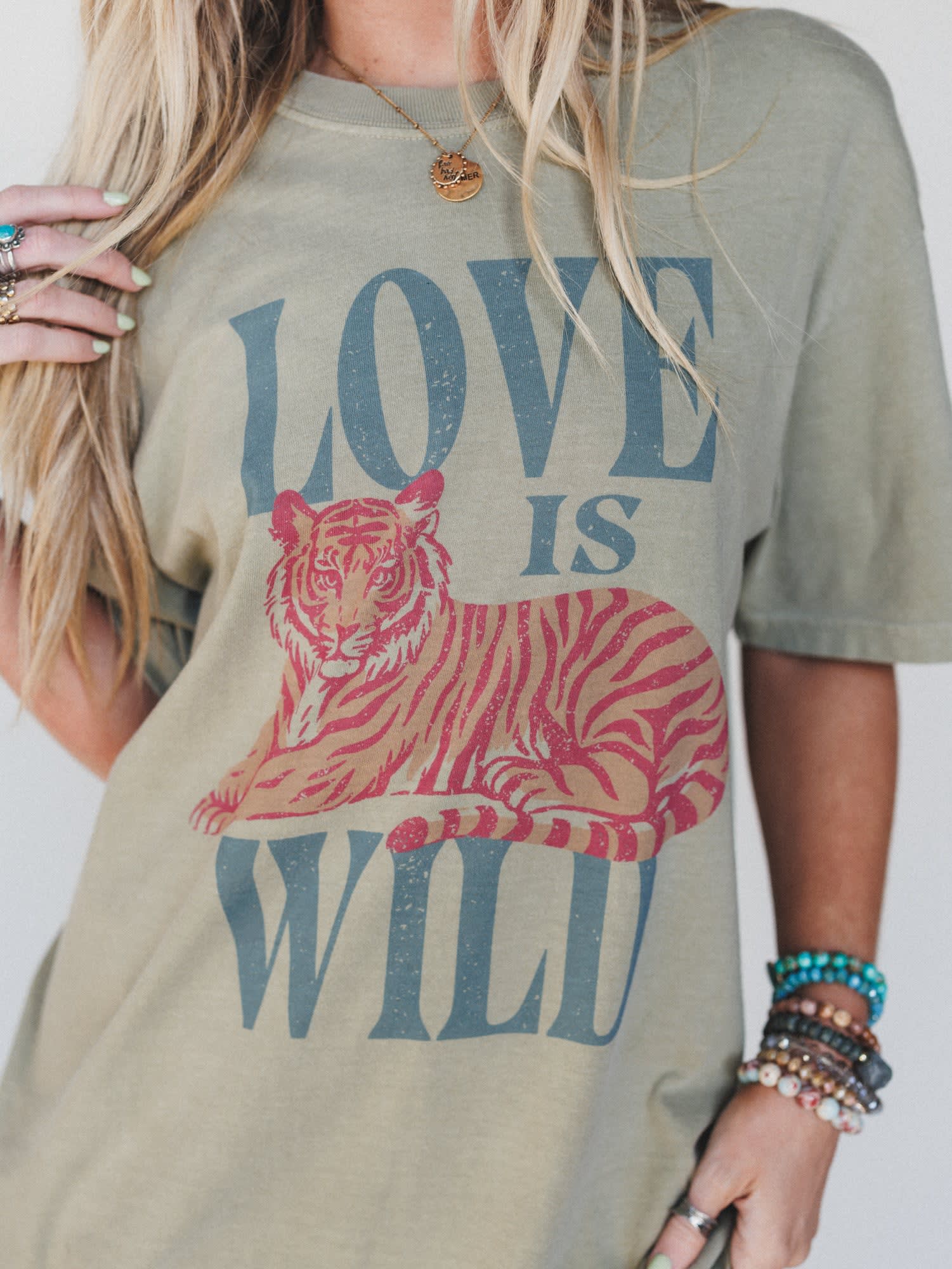 • “LOVE IS WILD” front text with bold pink tiger artwork