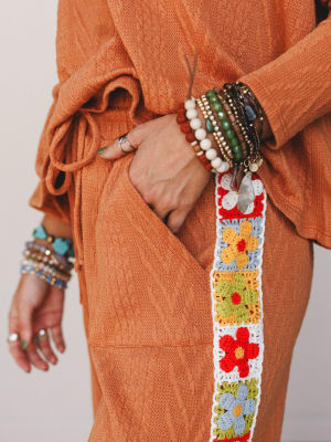 - Colorful crochet floral trim down the sides adds a playful, vintage vibe