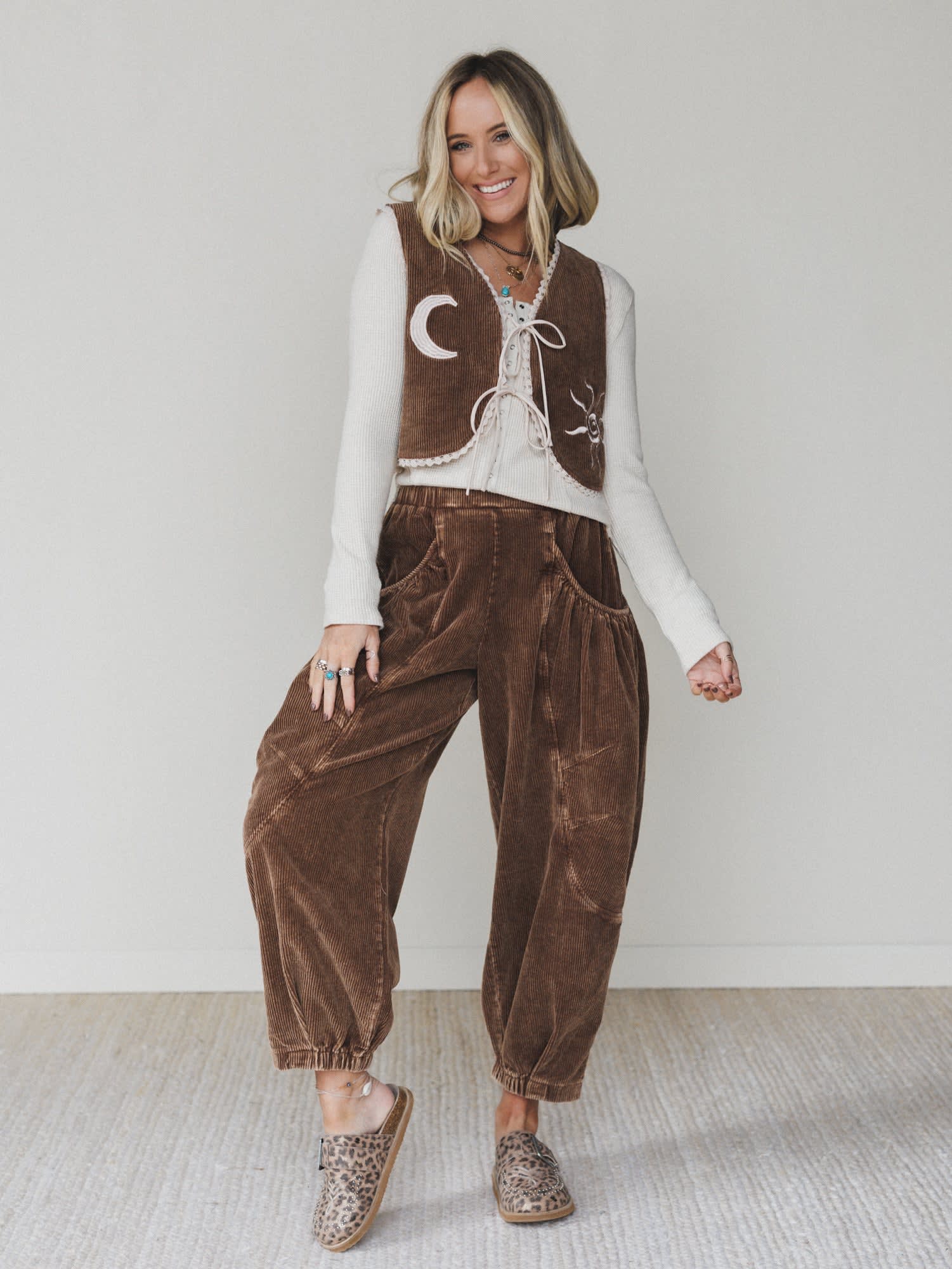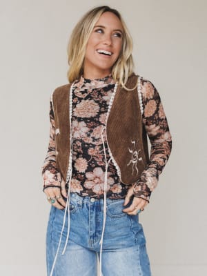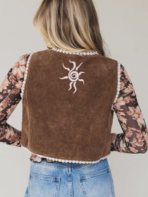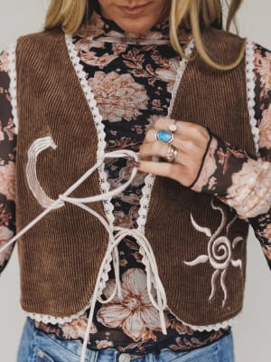 Vintage Western charm meets moonchild energy in The Nest Nora Corduroy Vest Top. This piece is all about self-expression, with celestial embroidery and sweet lace trim to bring out your inner wanderer.