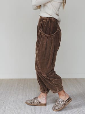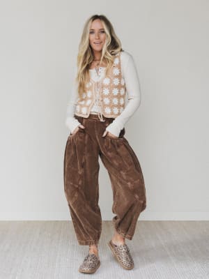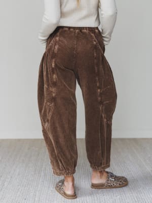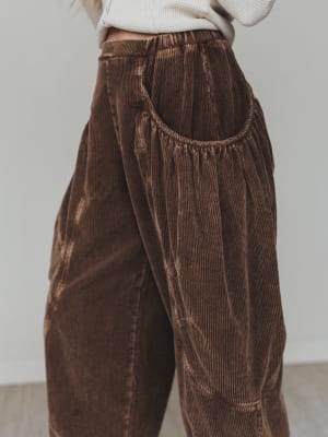 These are not your average cords. The Nest Nora Gathered Barrel Corduroy Pant blends laid-back comfort with bold boho character. With oversized pockets and a cool, cocoon shape, they're made for moving through the season with ease and style.