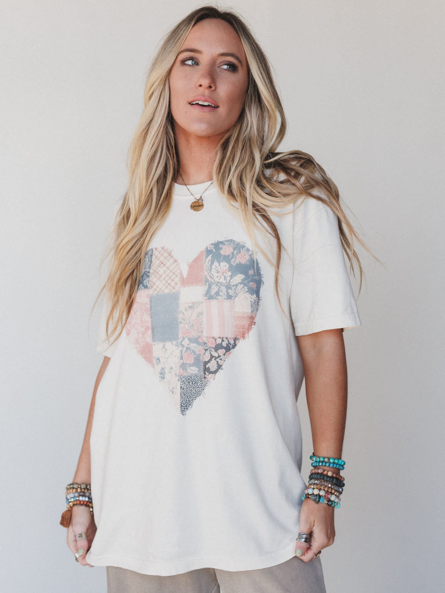 Patch together your playful side with the Patches of Love Graphic Tee from The Nest. Featuring a large heart design made up of sweet vintage-inspired patch prints, this soft, easygoing tee brings a touch of nostalgia and charm to your casual wardrobe. With a relaxed fit and creamy ivory tone, it’s as cozy as it is cute.