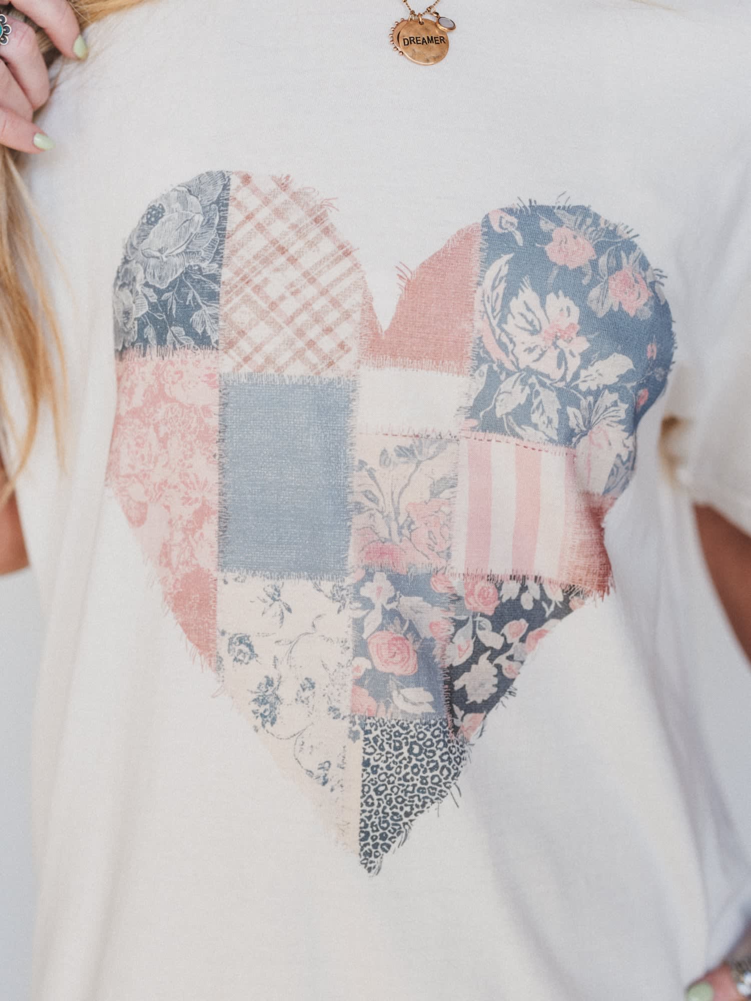 - Patchwork heart graphic in floral, gingham, and denim textures