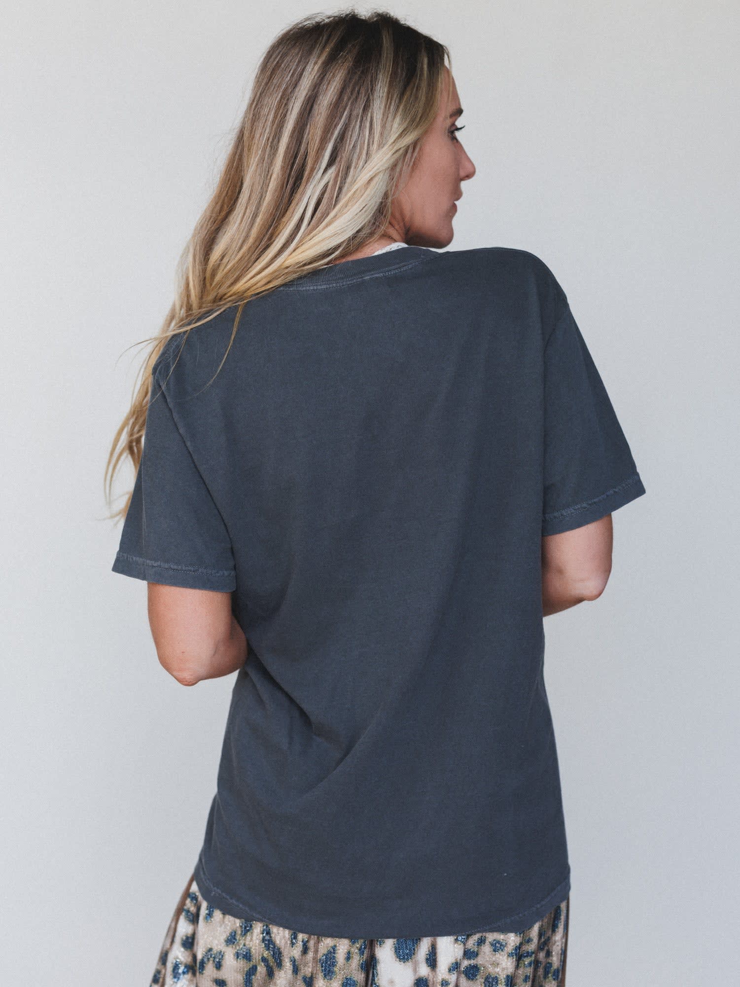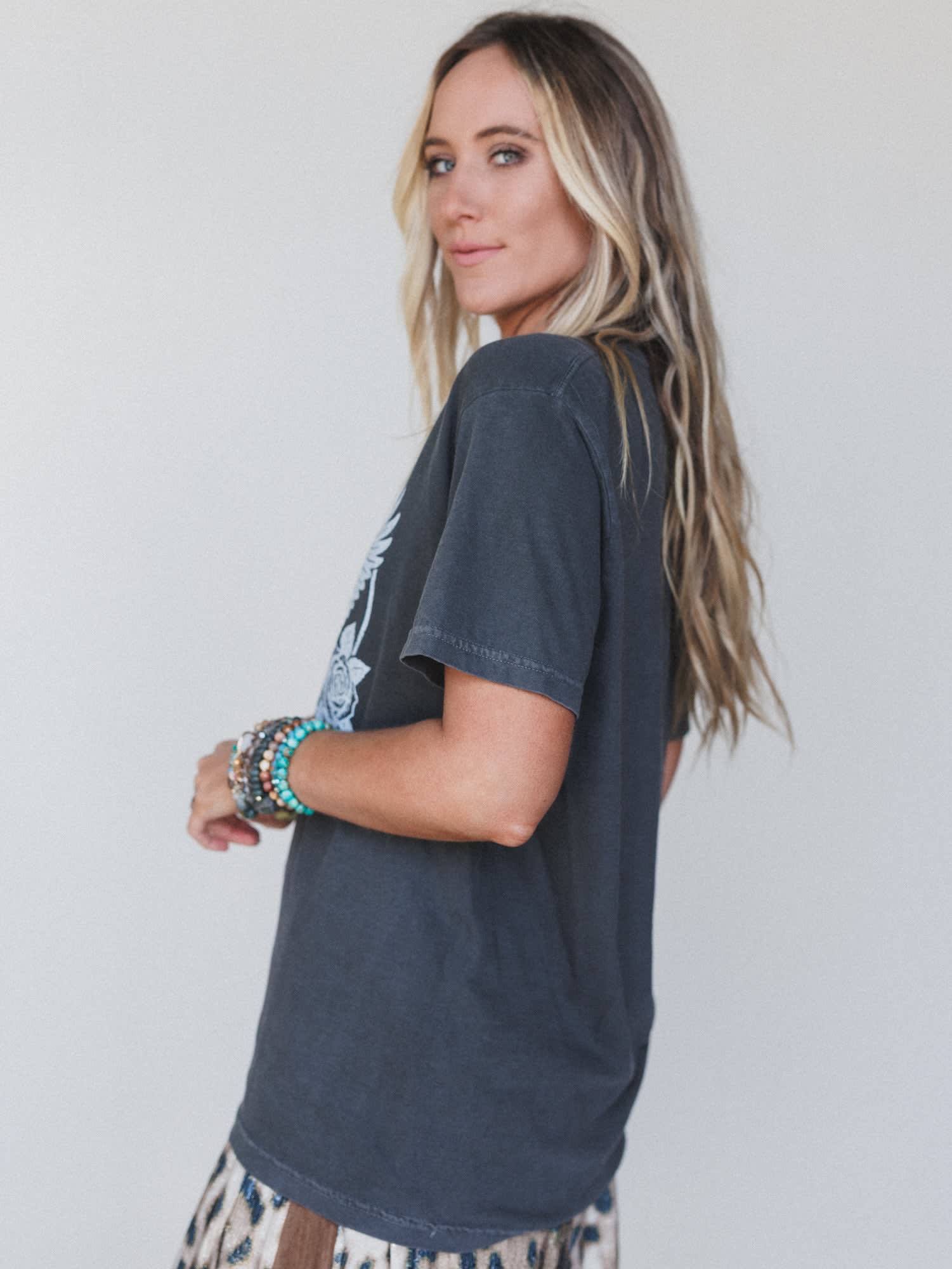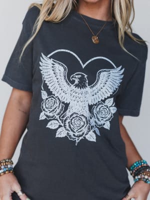A little edge, a little love. The Soaring Romance Graphic Tee features a bold eagle in flight, wings stretched wide within a heart silhouette, perched above blooming roses. The washed charcoal base gives this tee that perfectly worn-in, vintage-rocker feel with a poetic twist.
