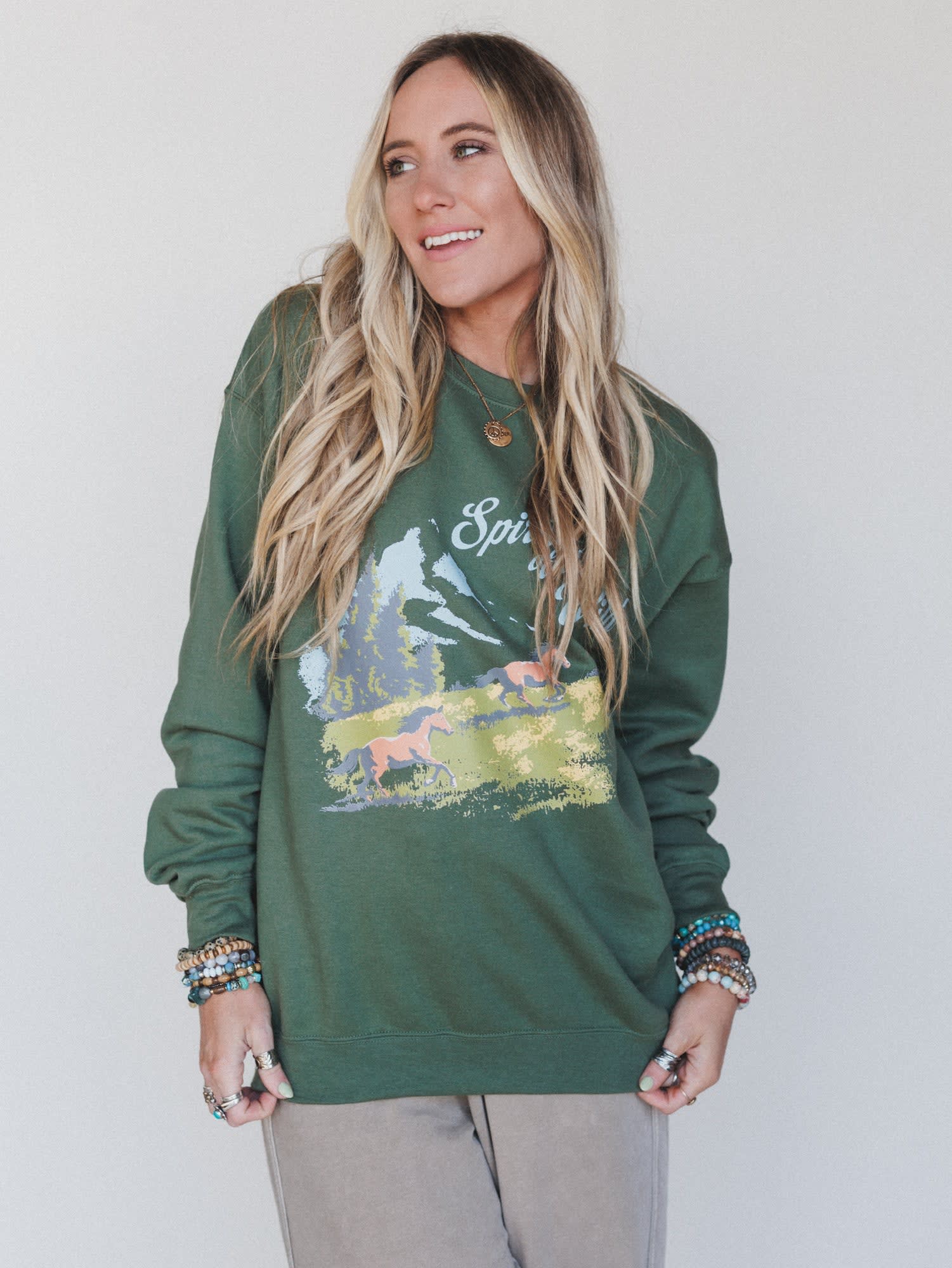 Tap into your inner free spirit with the Spirit Of The Wild Sweatshirt. This cozy crewneck features a painterly mountain landscape and wild horse graphic with vintage-inspired text that reads “Spirit of the Wild”—a reminder to roam freely and live boldly. The forest green hue adds a grounded, earthy feel while the soft fleece interior keeps things toasty for your next adventure.