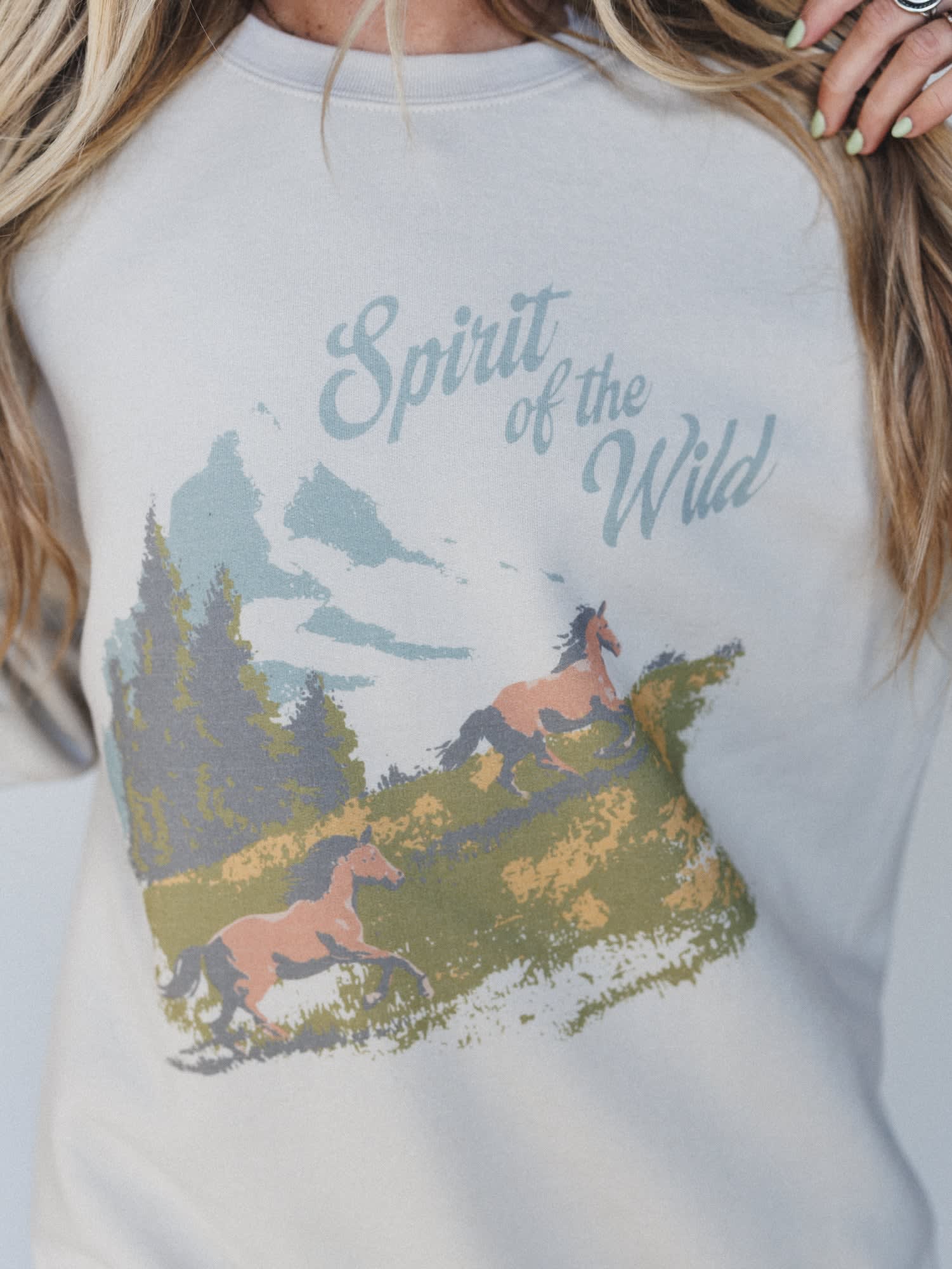Same wild spirit, softer palette. The Spirit Of The Wild Sweatshirt now comes in a dreamy sand tone that brings a vintage, sun-faded feel to this beloved graphic. With a tranquil mountain backdrop and galloping horses in muted desert hues, this pullover is made for roaming near or far.