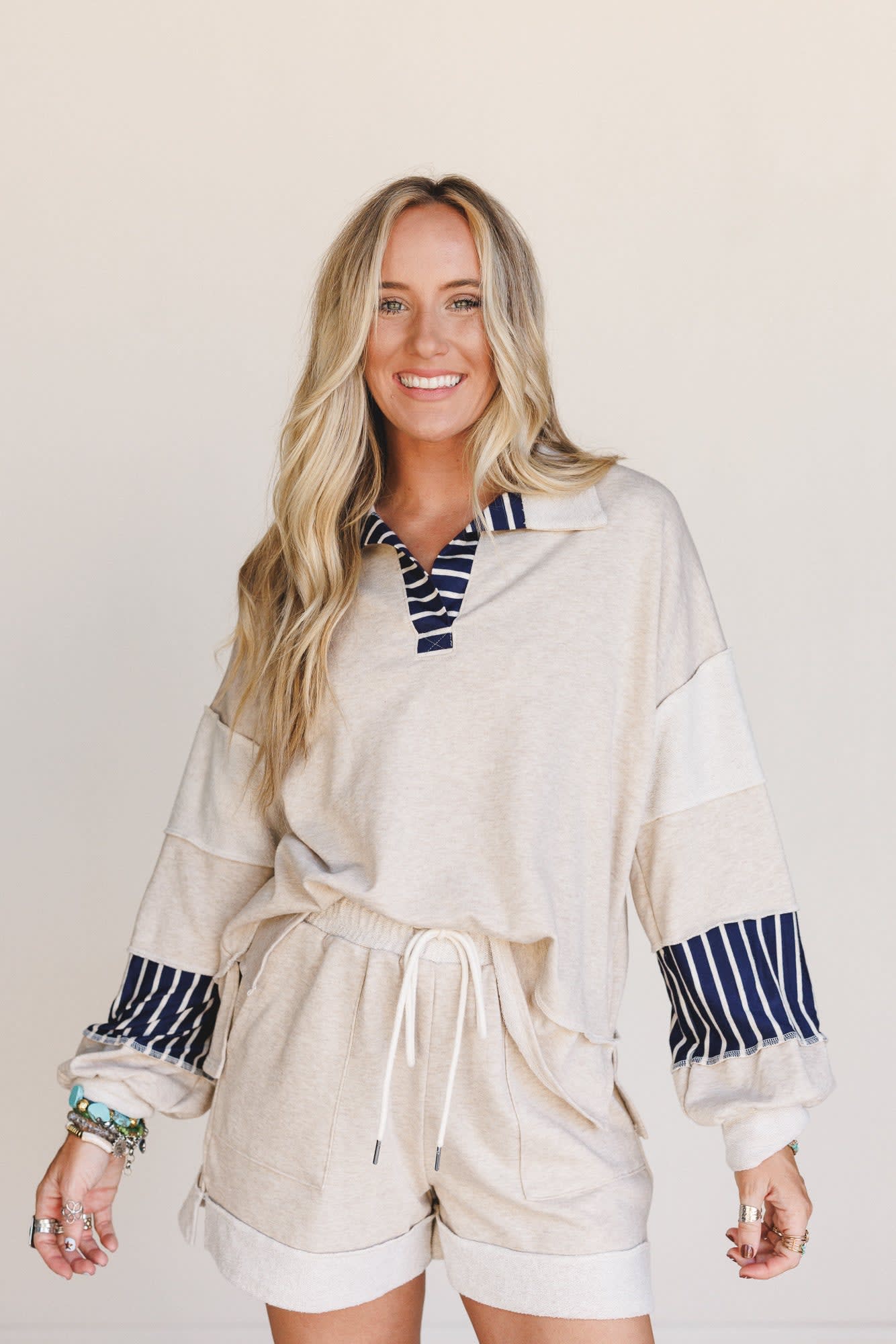 • Soft oatmeal-toned knit with navy striped contrast accents for a nautical twist