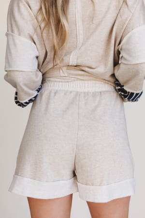 • Drawstring shorts with elastic waist, side pockets, and turned-up cuffs