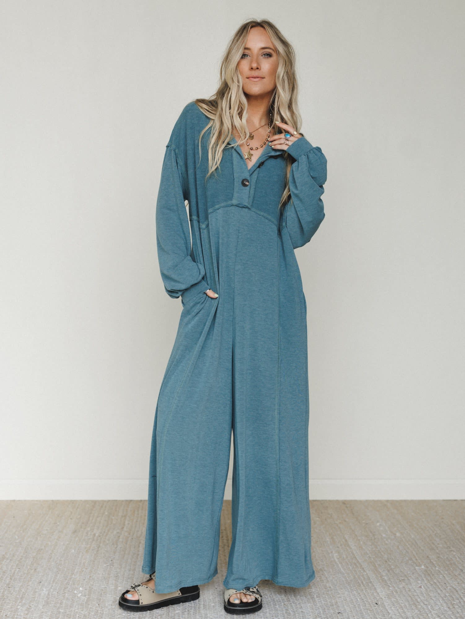 Style it with messy waves, stacked rings, and a good book—this jumpsuit is made for dreamy, do-nothing days.