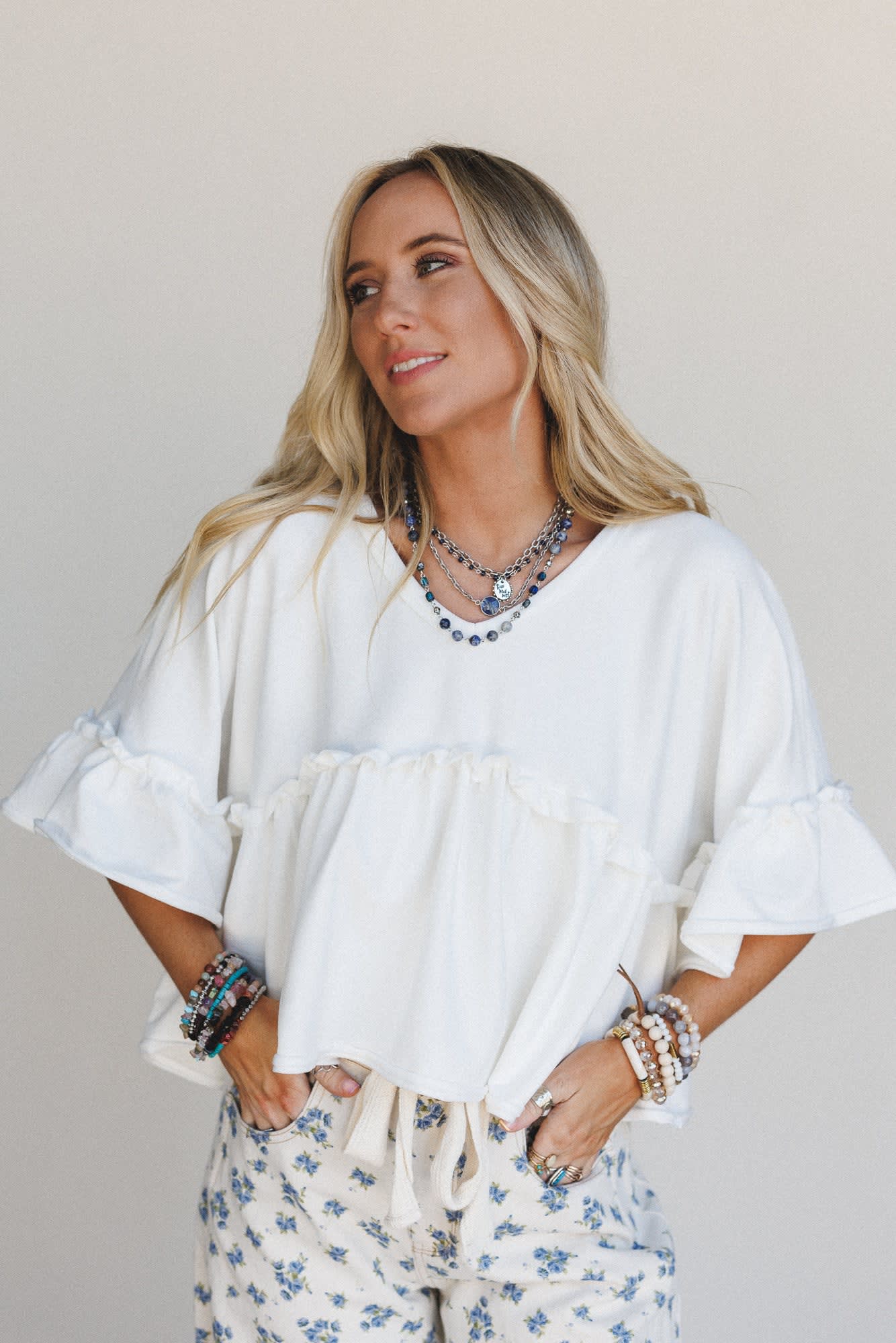 Channel that carefree boho spirit in the Timeless Way Top. With its breezy silhouette, soft ruffles, and off white hue, this top is made for twirling through your day with total ease and joy.
