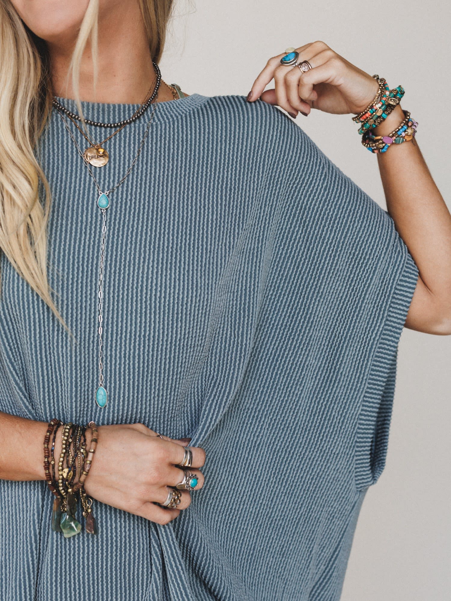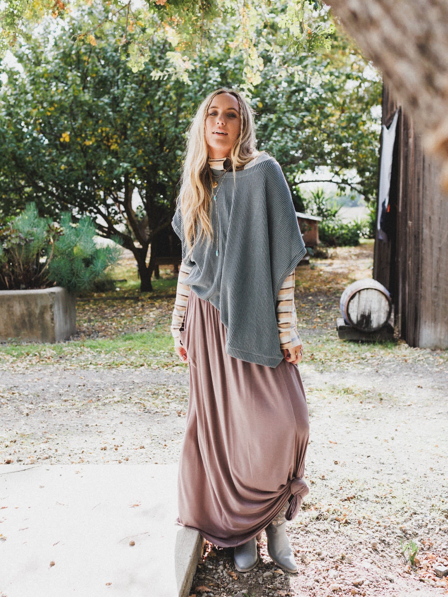 • An ideal everyday boho outfit—perfect for lounging, brunching, or spontaneous road trips with boots and stacked bracelets