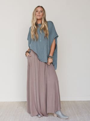 • Paired with The Perfect Pocketed Maxi Skirt, a stretchy, full-length favorite in soft mocha, designed with wide pockets and a flowy silhouette that can be knotted at the hem for a more styled look