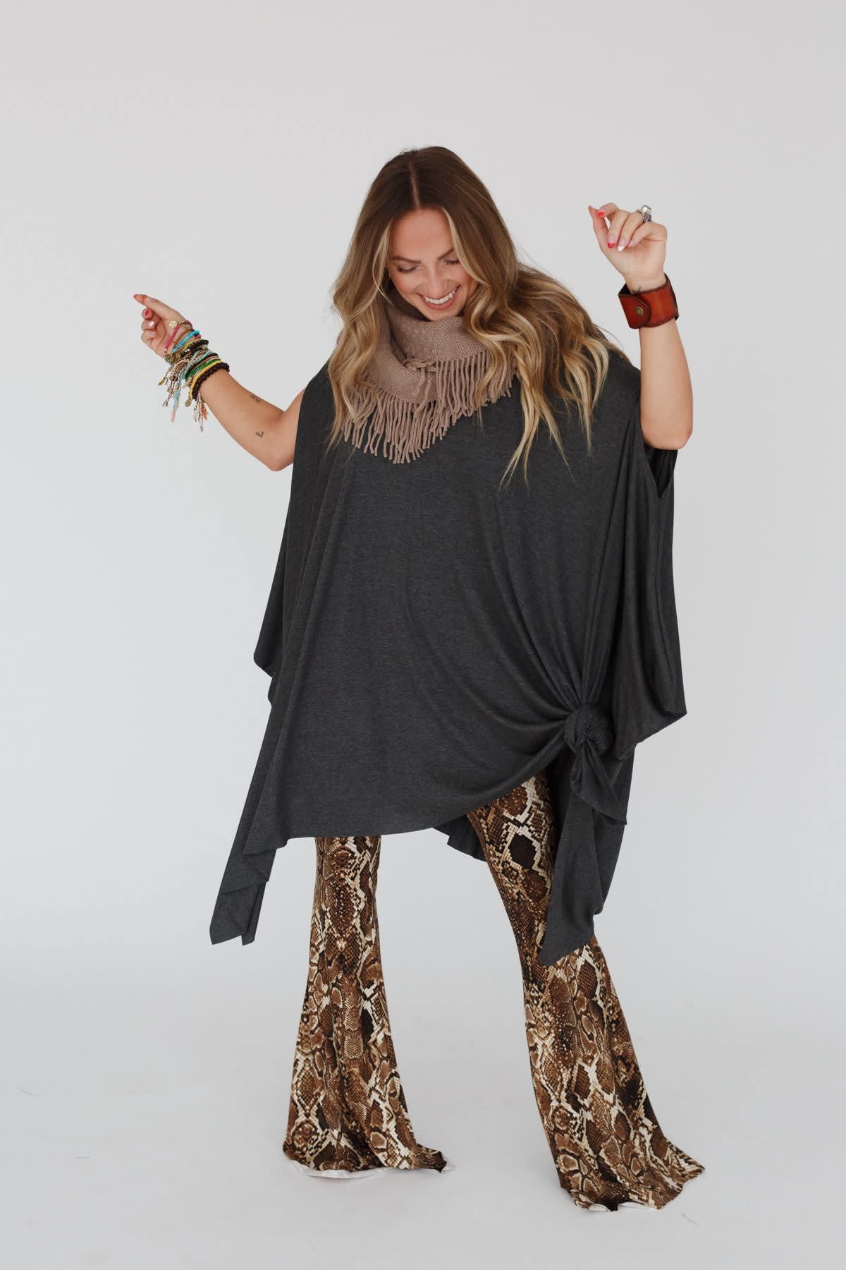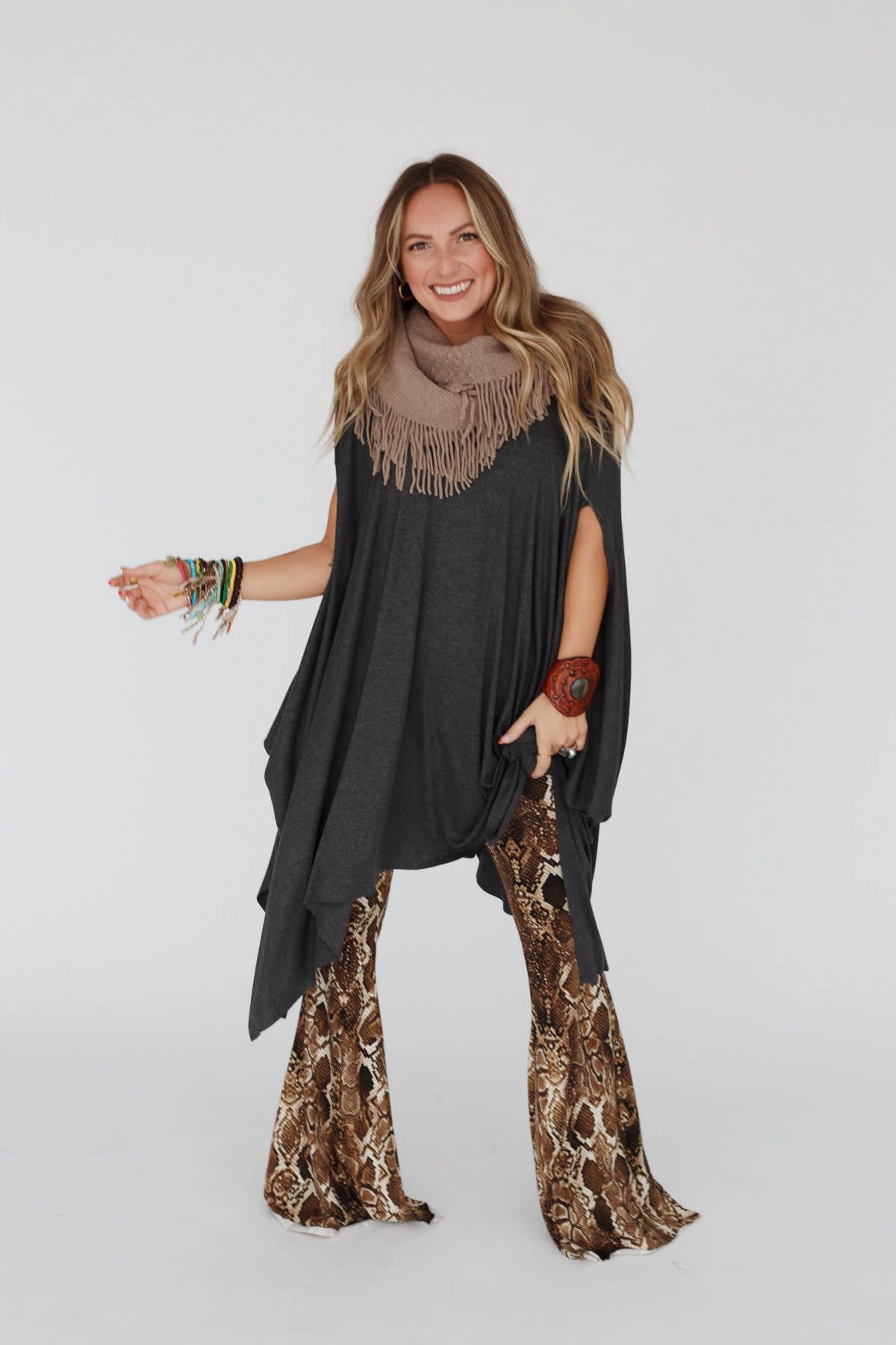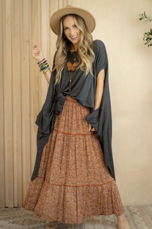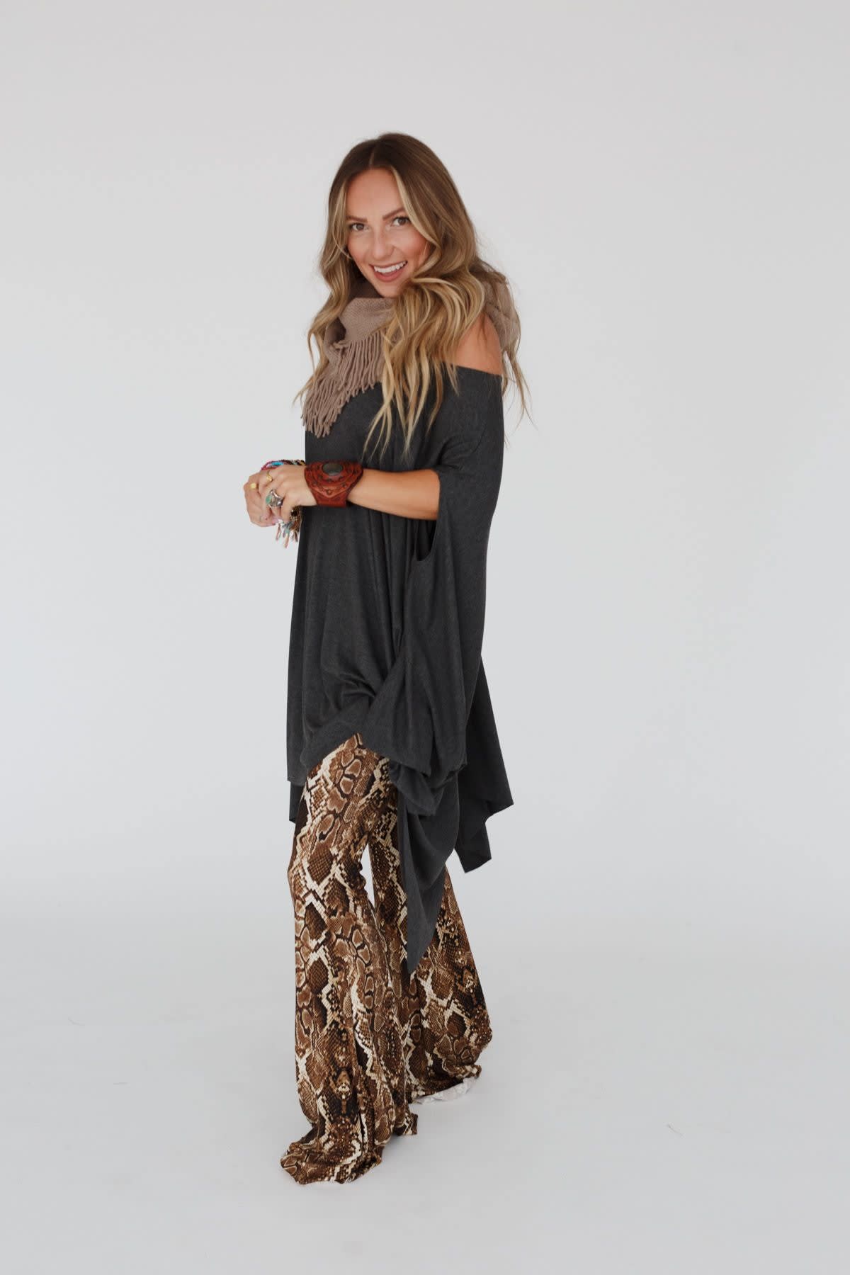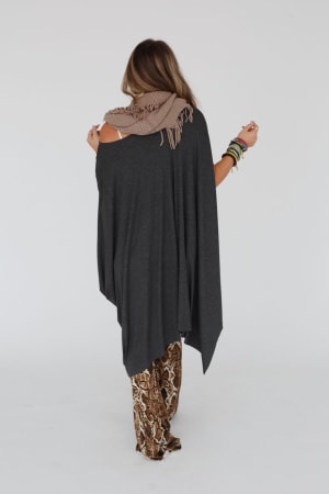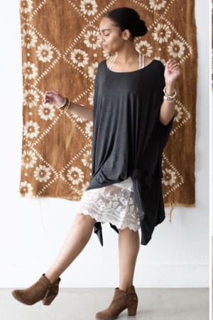 This longline boho top can be layered over tanks and bralettes, worn on or off-the-shoulder, and styled with a knot in the hem.