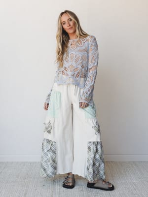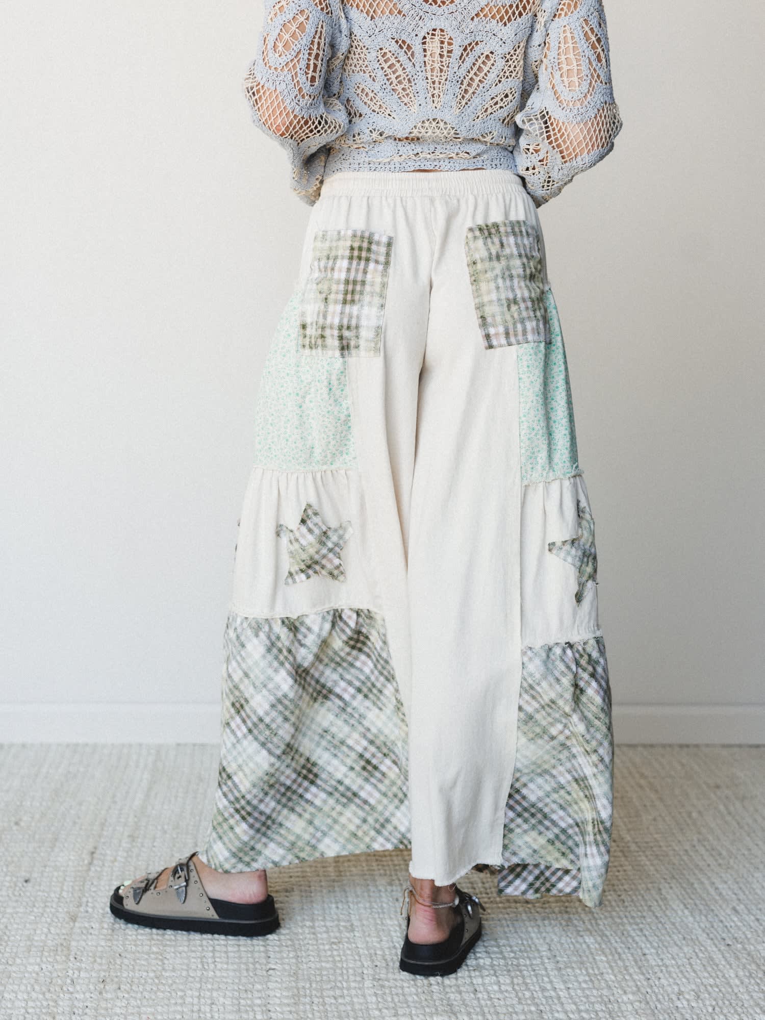 - Wide leg pants showcase charming patchwork detailing with a comfortable elastic waistband for all-day wear.