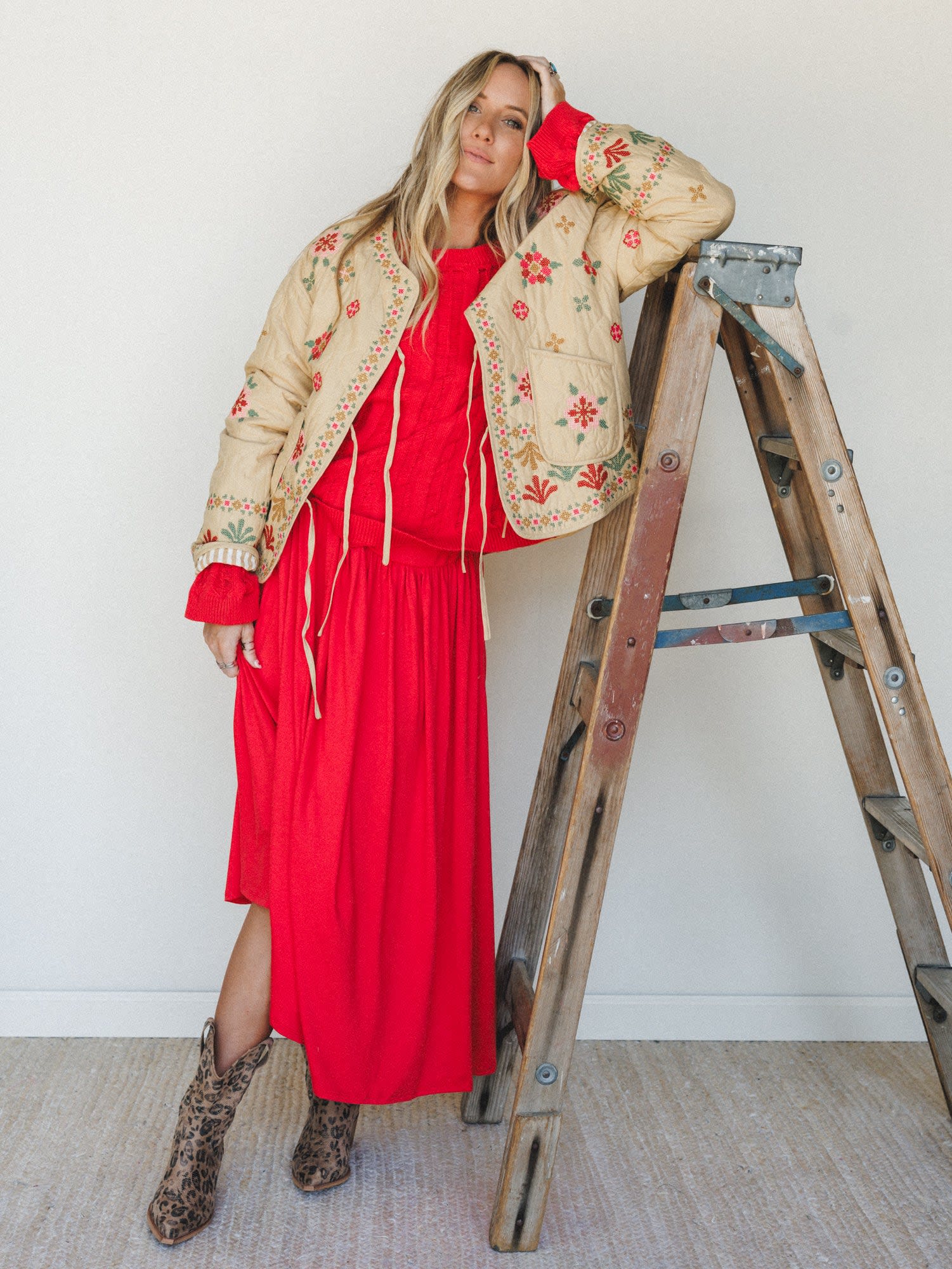 • Includes a flowy midi dress, cozy knit sweater, and embroidered floral jacket that layer beautifully together or work as standalone statement pieces.