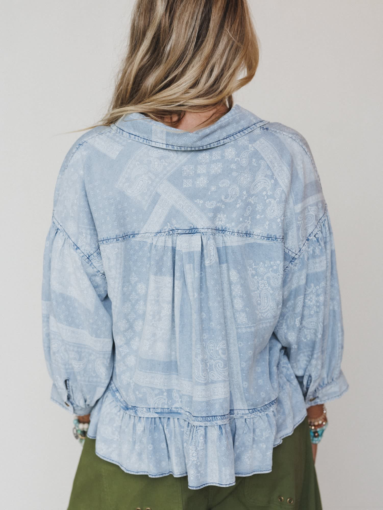 - Soft light denim blue fabric with subtle patchwork-inspired paisley print