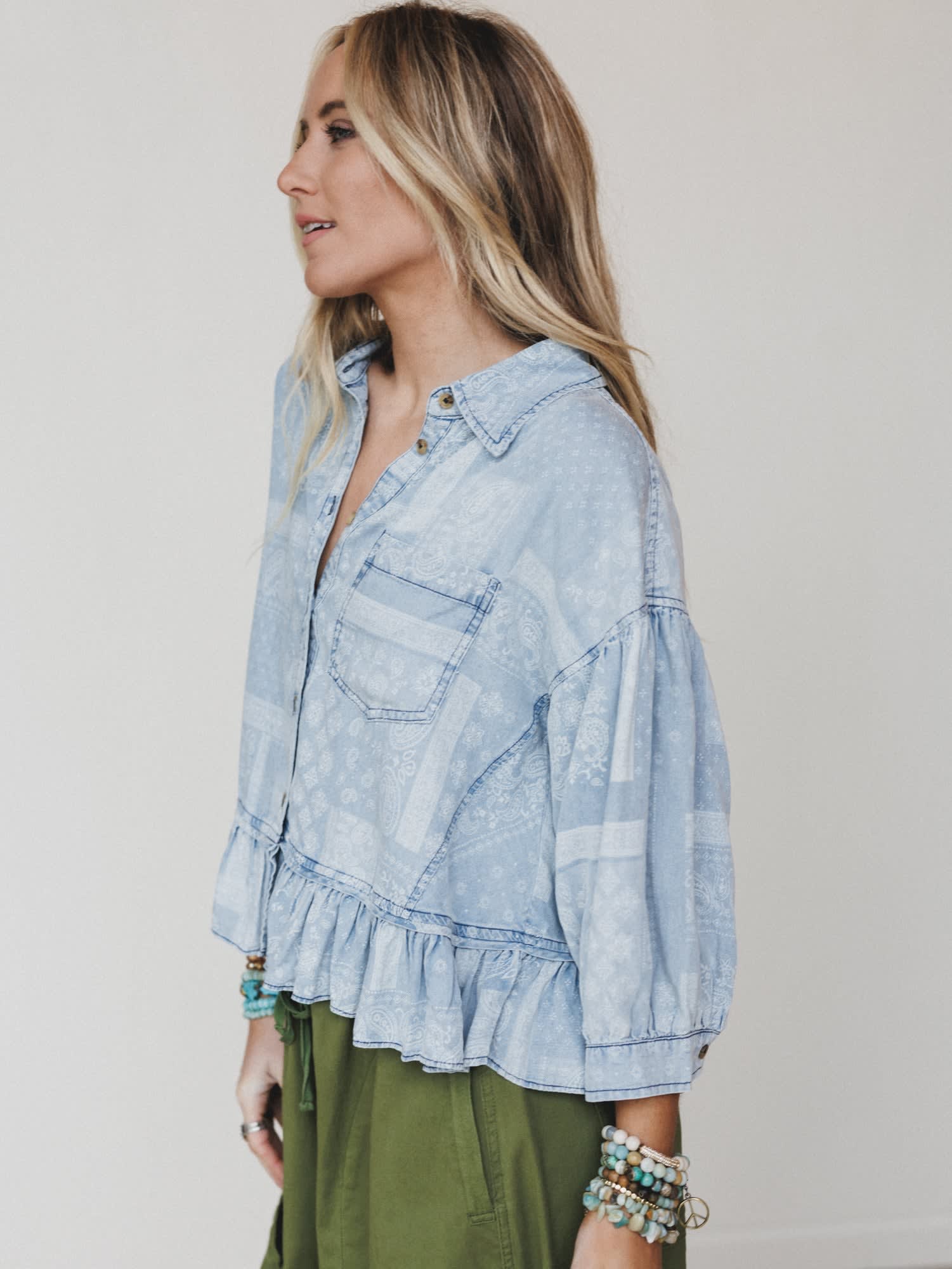 - Button front blouse with a relaxed, flowy silhouette