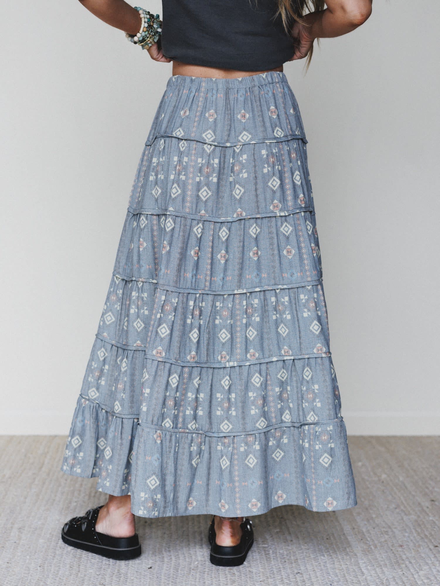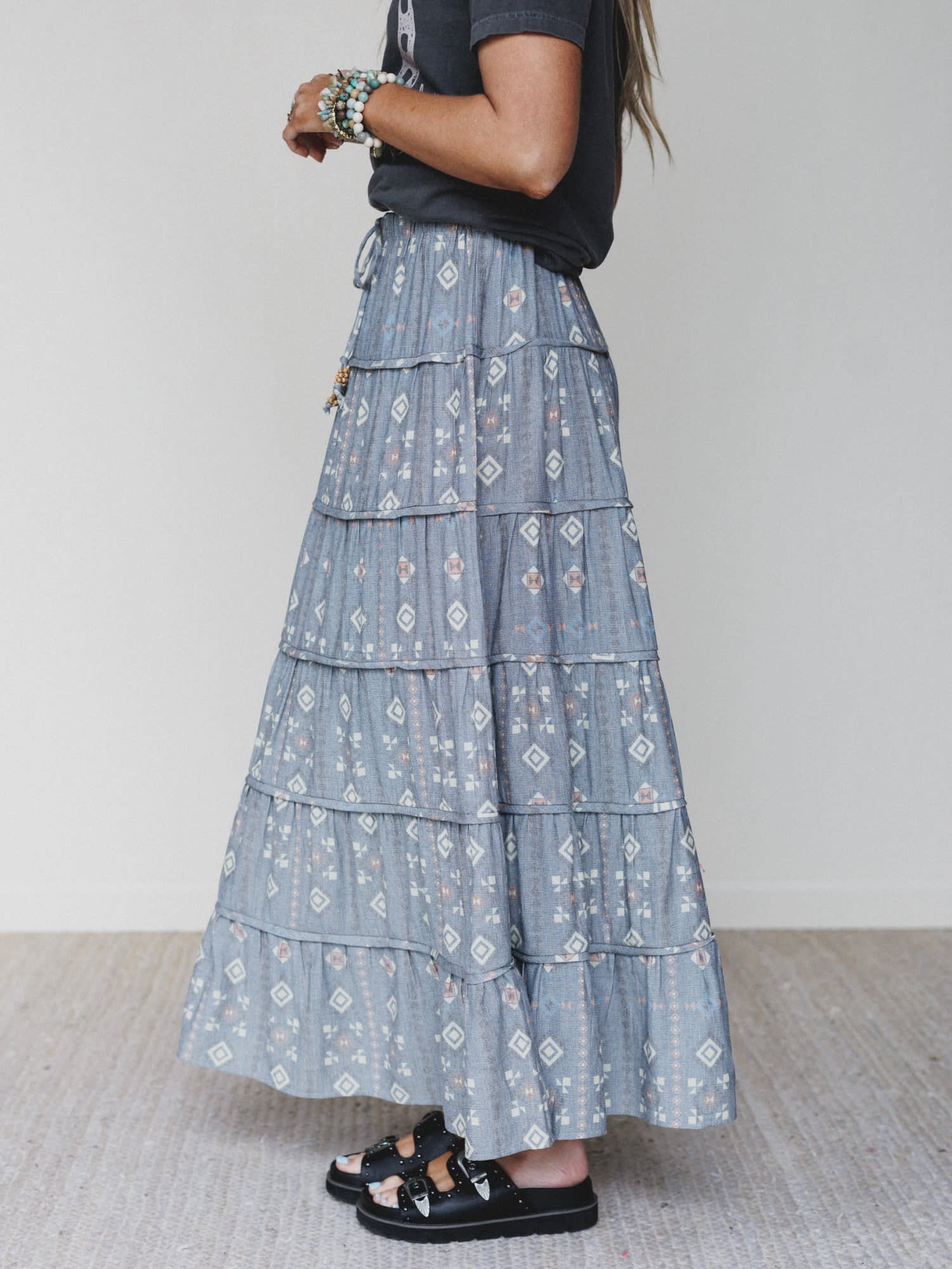 - Tiered maxi skirt silhouette with flowy, feminine movement