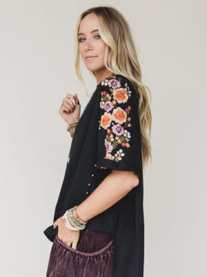 Bring on the drama in the best way with the Tomcat Studded High Low Top—a relaxed statement tee that takes boho-chic to new heights. This everyday staple is anything but basic with embroidered floral sleeves and edgy studded details. Whether you're headed to a casual coffee date or dancing under the stars at your favorite music fest, this top has you styled to stand out.